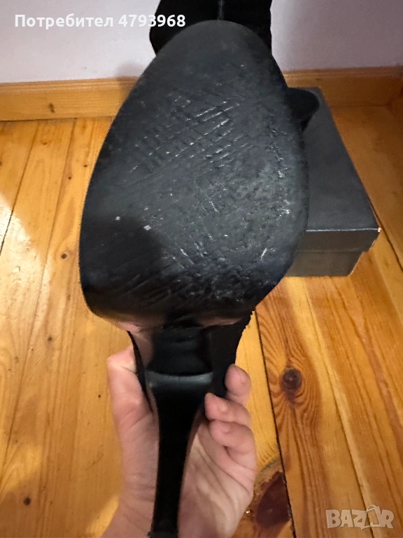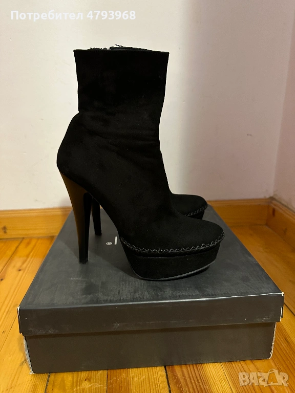Черен велур. Естествена кожа. Носени само веднъж. Височина на тока 13см. с платформа отпред 3см.