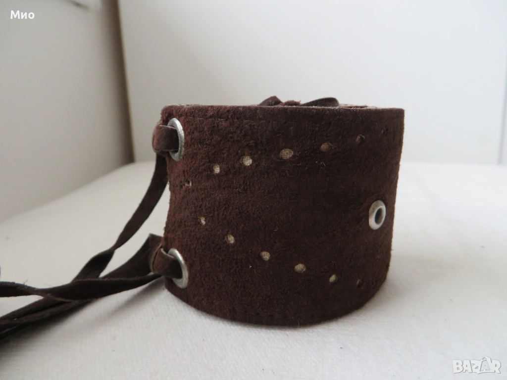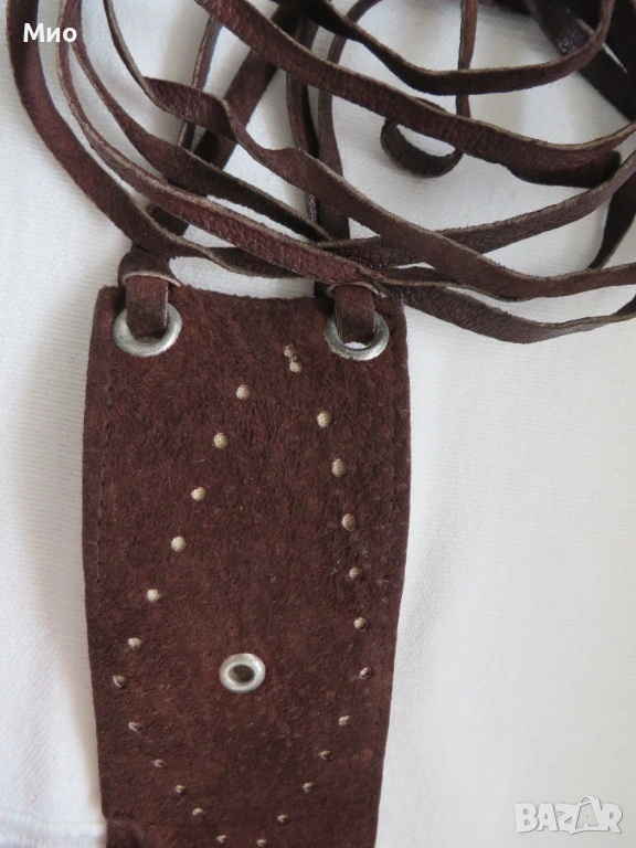 Кафяв колан с дължина на плътната кожена част 65 см и ширина 5,5 см. Външната част и връзките са от естествен велур. Дължината на връзките само от едната страна е 55 см, което прави колана много универсален (за хора с различен размер на талията).