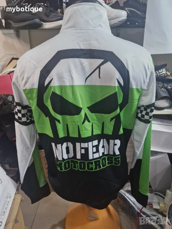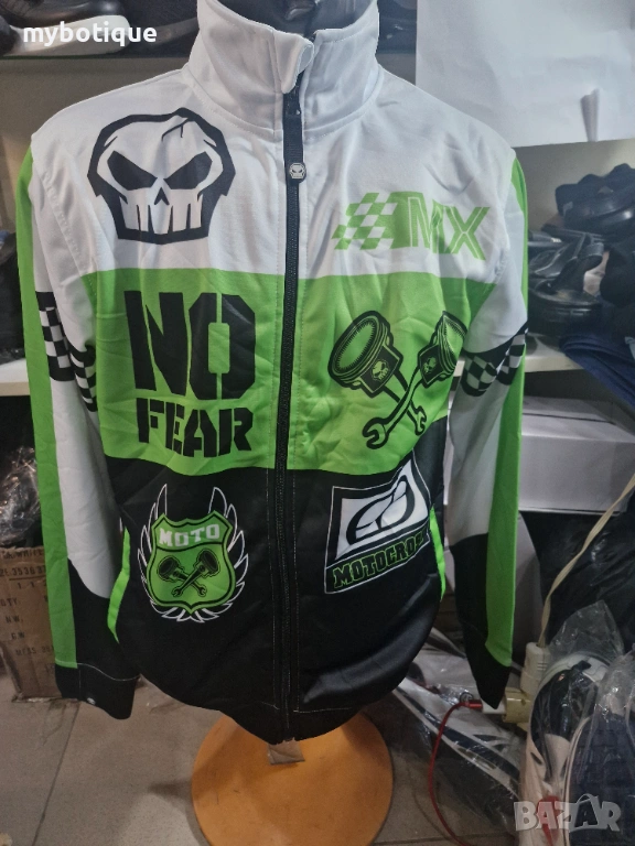 Супер оферта 25 € ,Това яке е тематично облекло, вдъхновено от мотокроса, отличаващо се с графики на черепи, пистони и логото "No Fear". Превод на текста от изображението Гръден кош (текст): БЕЗ СТРАХ Гръден кош (лого): MX Долна част (текст): МОТОКРОС