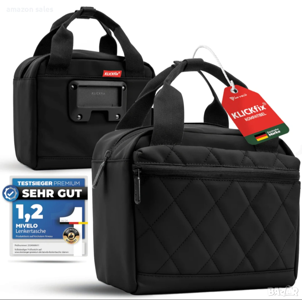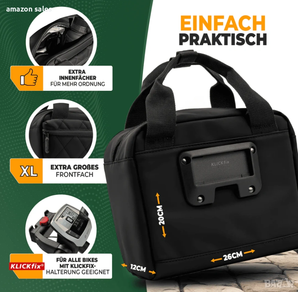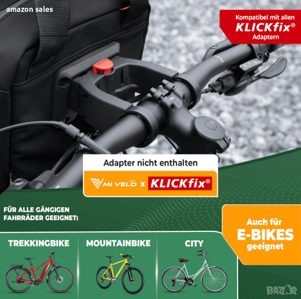 Съвместим с всички KLICKfix стойки (стойката не е включена в комплекта)(подходящи и за електрически велосипеди)