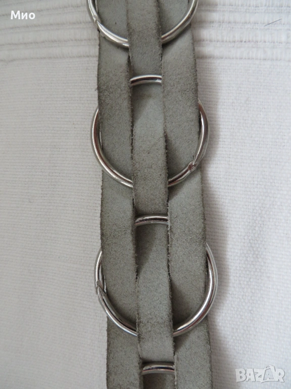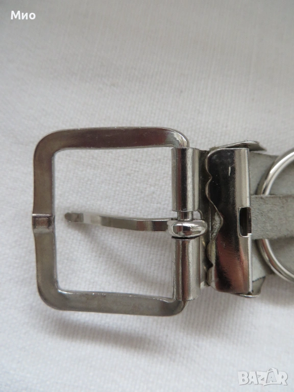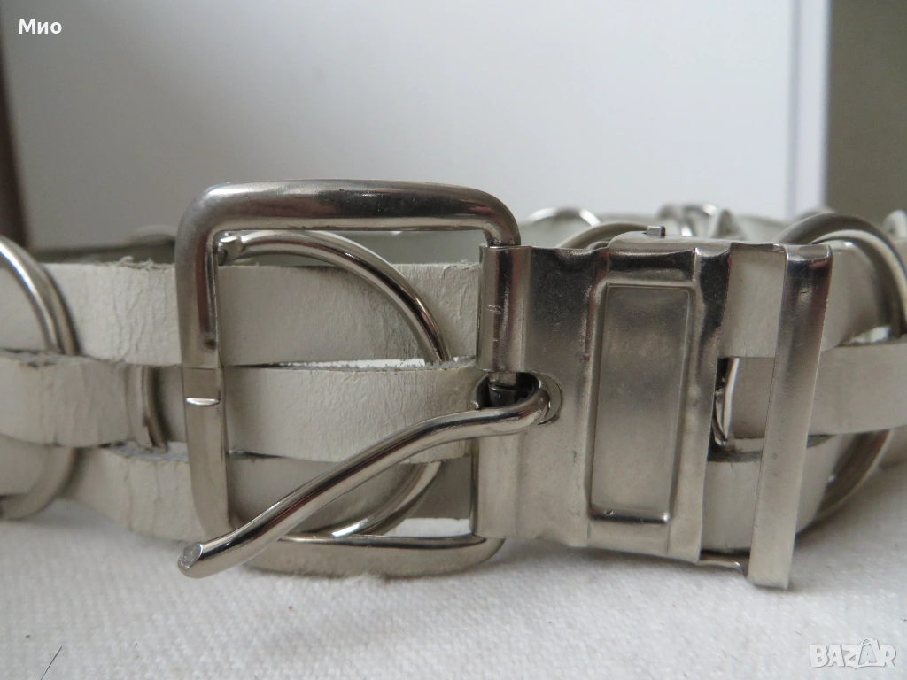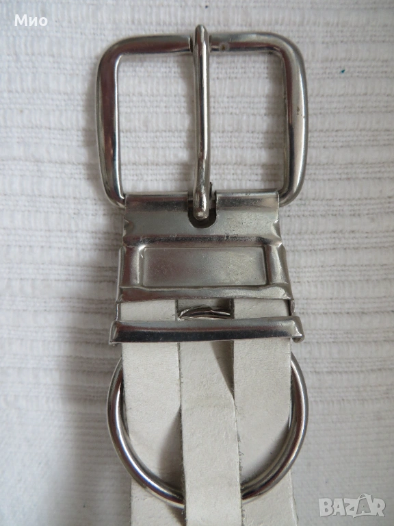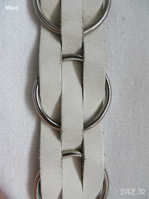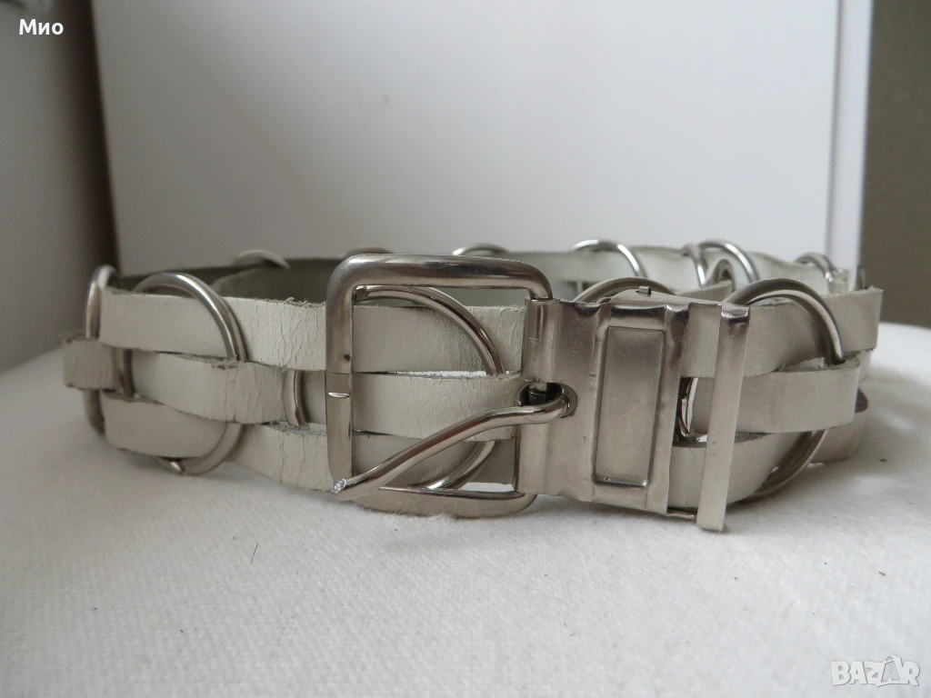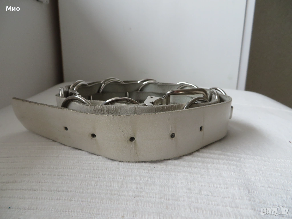 Качествен бял колан от естествена кожа с дължина 91см и ширина 3,5 см. Изработен е от еднослойни, здрави и гъвкави кожени ленти, в комбинация с декоративни метални кръгове. Има метална сваляща се катарама и 5 стандартни дупки. Липсва един от металните кръгове (около средата).
