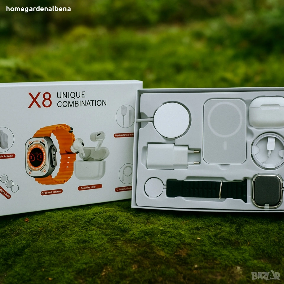 Ключови думи: смарт часовник, smartwatch X8, комплект 8 в 1, безжични слушалки, смарт гривна, часовник с bluetooth, часовник с разговори, аксесоари телефон, външна батерия, безжично зарядно, HOME & Garden by Albena