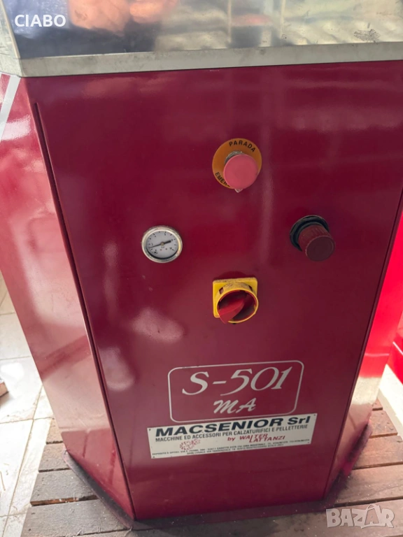 Машината се използва за залепване и притискане на подметки към обувките, осигурявайки здраво и равномерно съединяване.