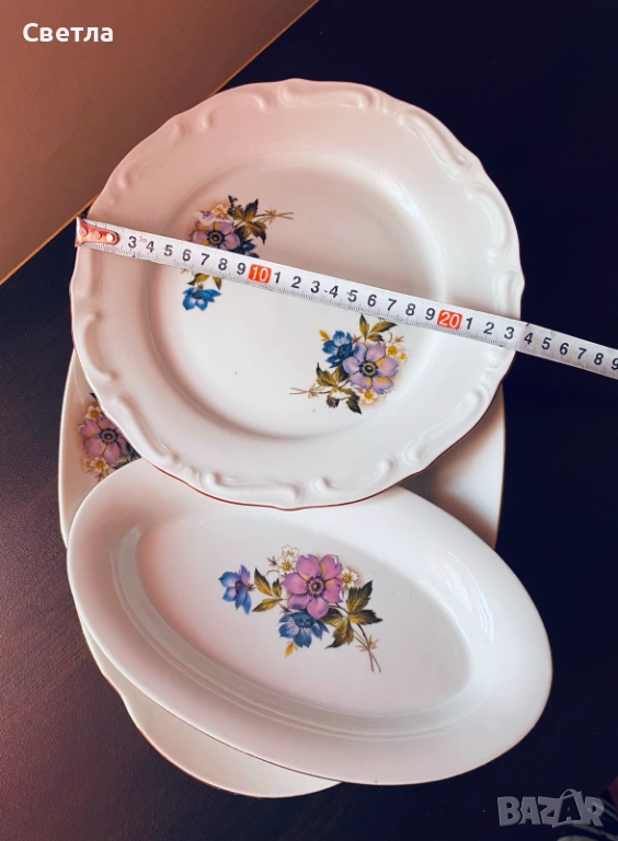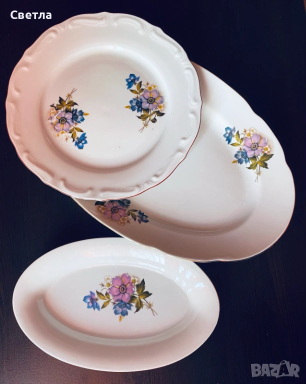 Чинии порцеланови, елипсовидни, и кръгли 19 бр. Дебел порцелан, Златен кант. БГ п-во,€47 → Обява 54167146