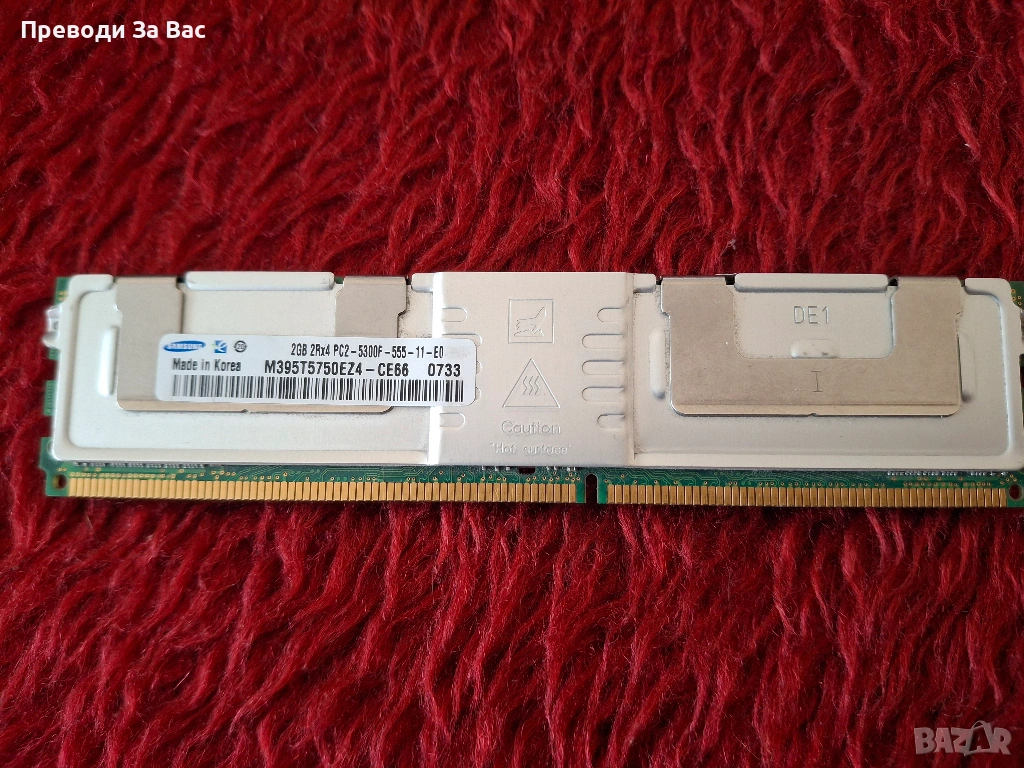Продавам сървърна RAM памет Samsung DDR2, 2 GB (M395T5750EZ4-CE66 SAMSUNG MEMORY 2GB 2RX4 PC2 5300F DDR2). Внимание, тази памет не работи на обикновени настолни машини с DDR2 слотове. Това е сървърна памет. Намира се в Пловдив, квартал Кючук Париж, в работно време. Предпочитам лично предаване или плащане по Revolut.