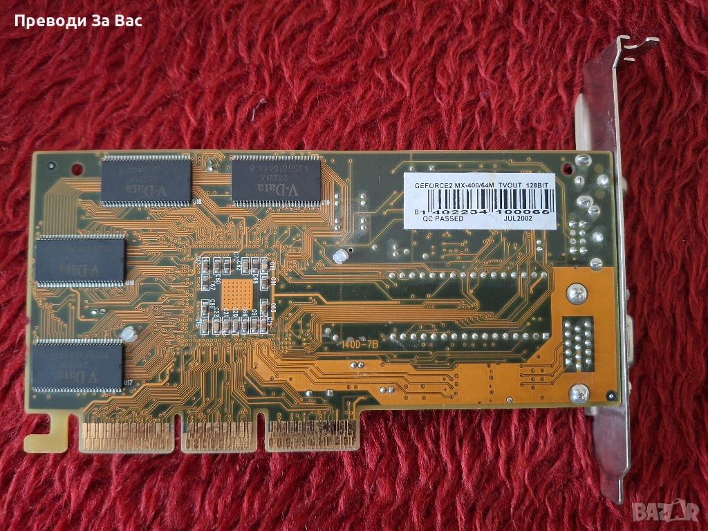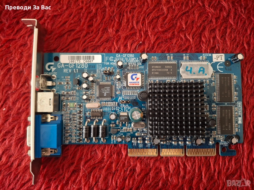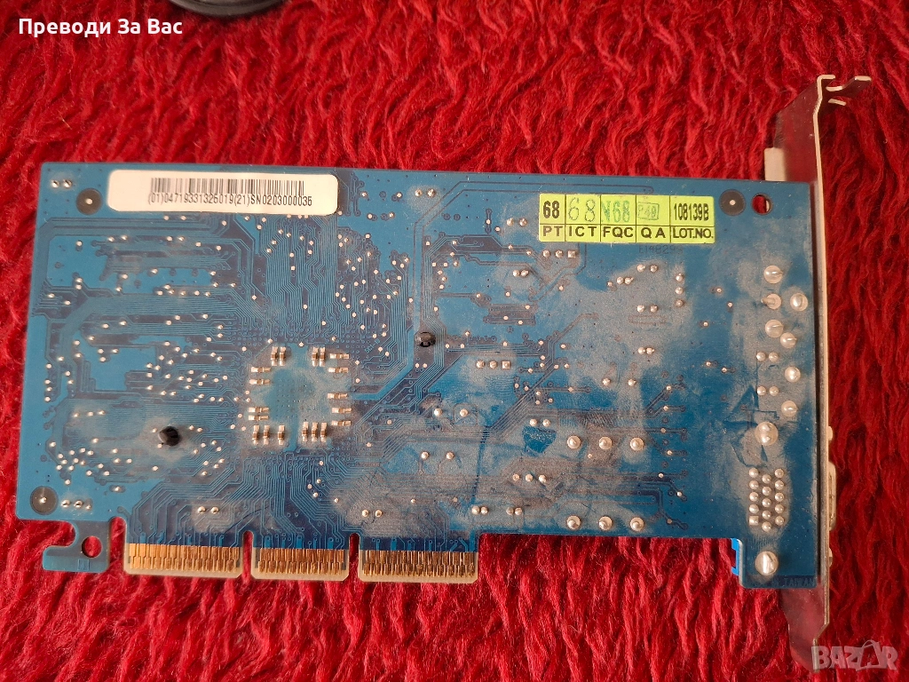 Продавам две видео карти AGP: GEFORCE2 MX-400 и Gigabyte GA-GF1280. Работещи. Всяка карта е снимана лице и гръб. Намират се в Пловдив, квартал Кючук Париж, в работно време. Предпочитам лично предаване или плащане по Revolut.