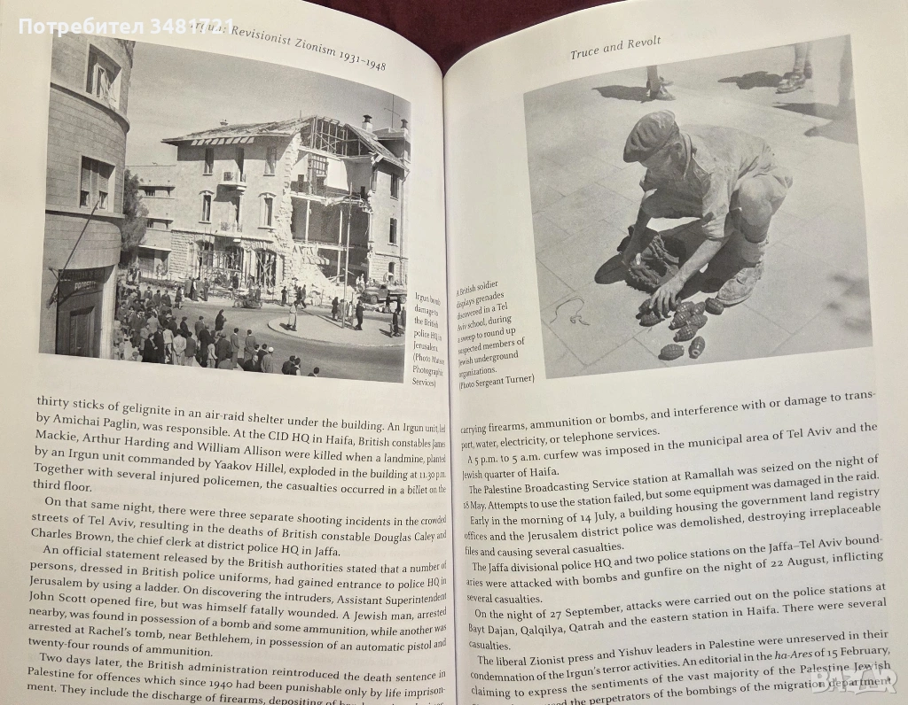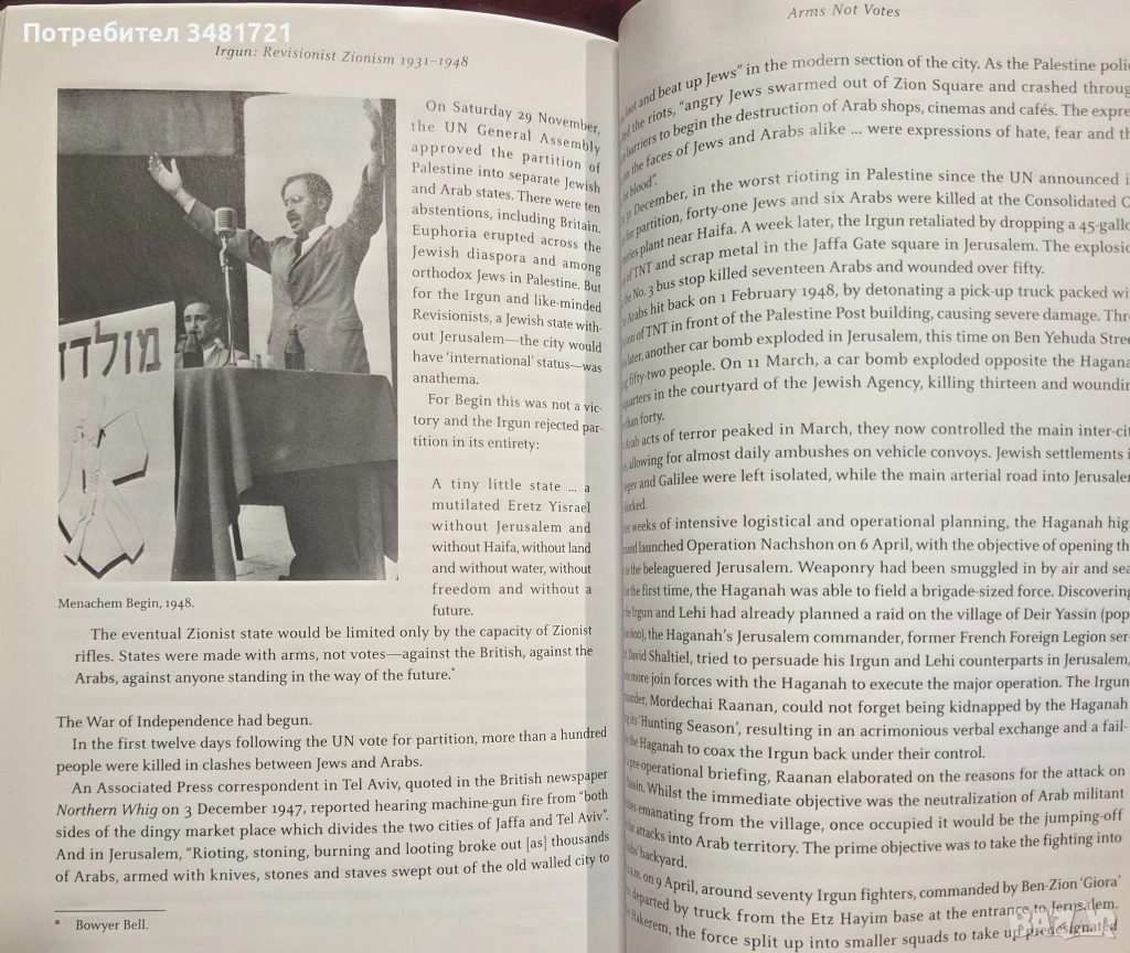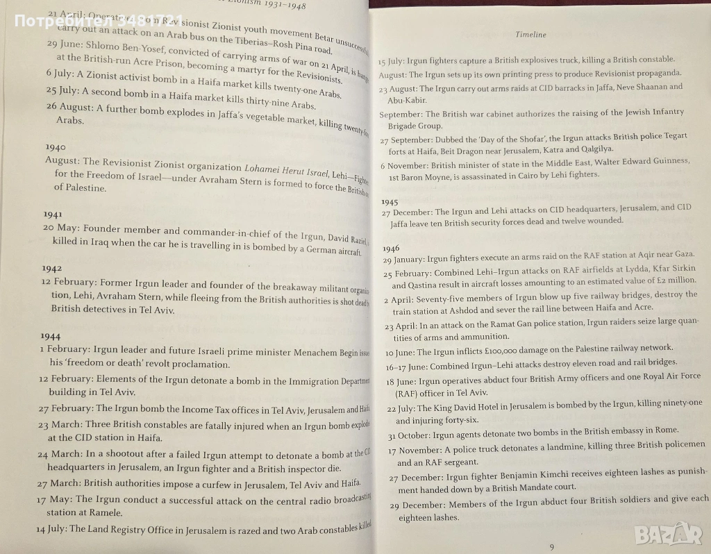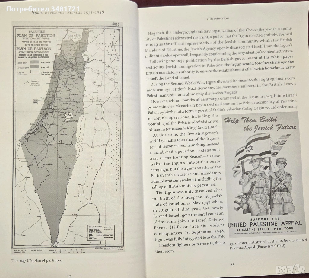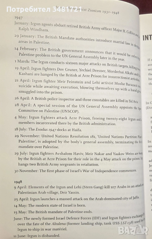 Авторът разглежда подробно, в текст и исторически фотографии историята на Иргун. През 1925та година Зеев Жаботински основава организация за ревизионистки ционизъм, чиято светска, дясна идеология ще доведе до формирането на Иргун, а след време и на партията Ликуд. Започвайки операции в британския мандат на Палестина през 31ва година, Иргун поема предимно охранителна роля, като същевременно улеснява продължаващата имиграция на евреи в Палестина. През 36та година, партизаните на Иргун започват да атакуват арабски цели. Британската Бяла книга от 1939та година отхвърля създаването на еврейска нация и като пряко следствие от това, партизаните на Иргун започват да атакуват британците.
