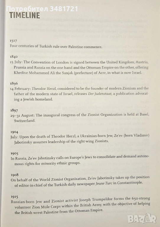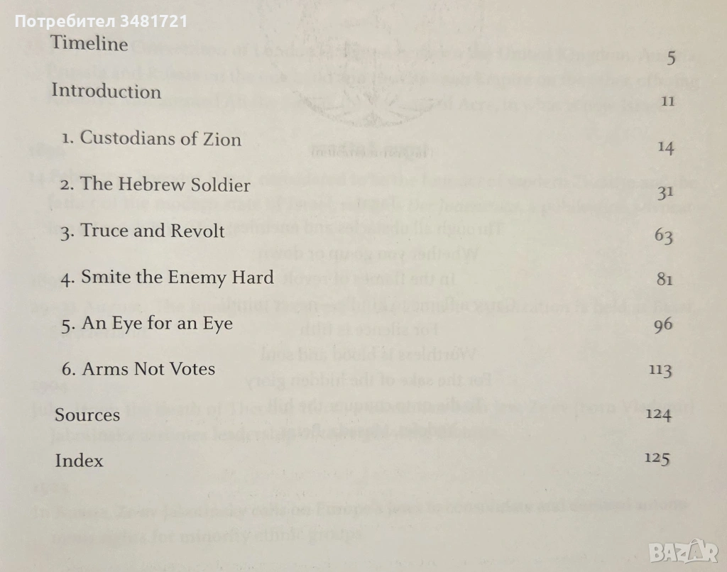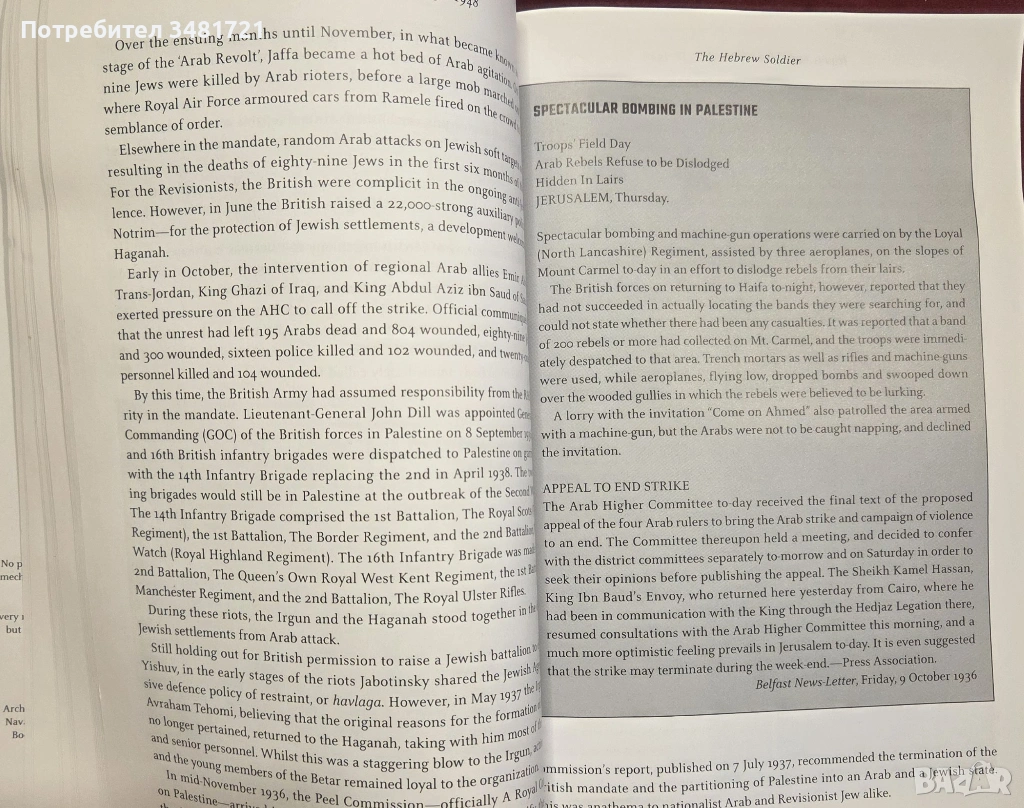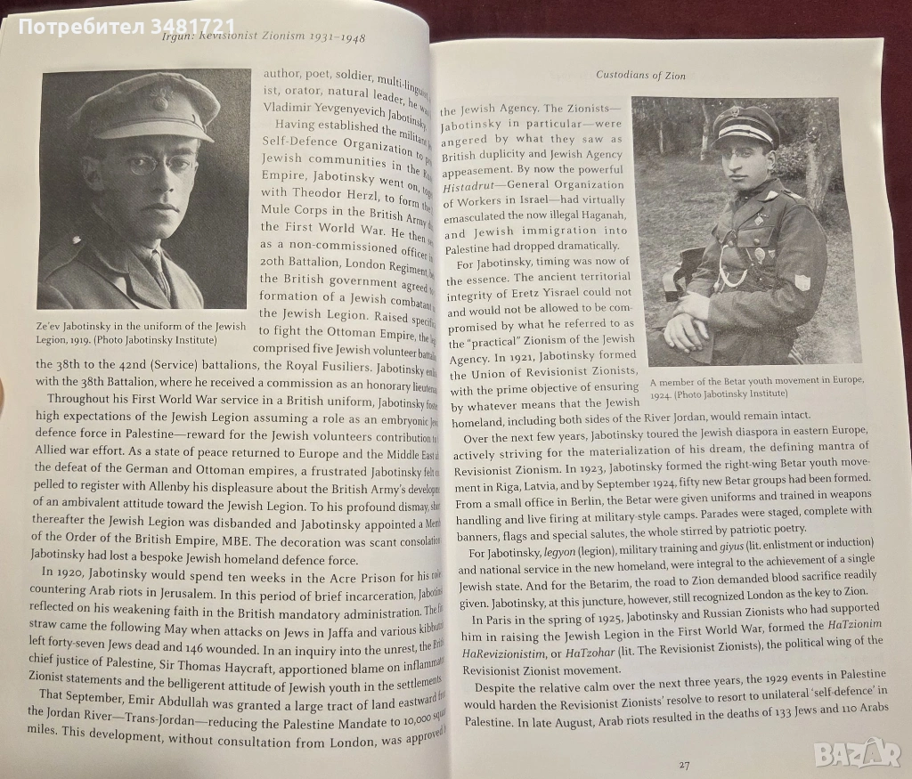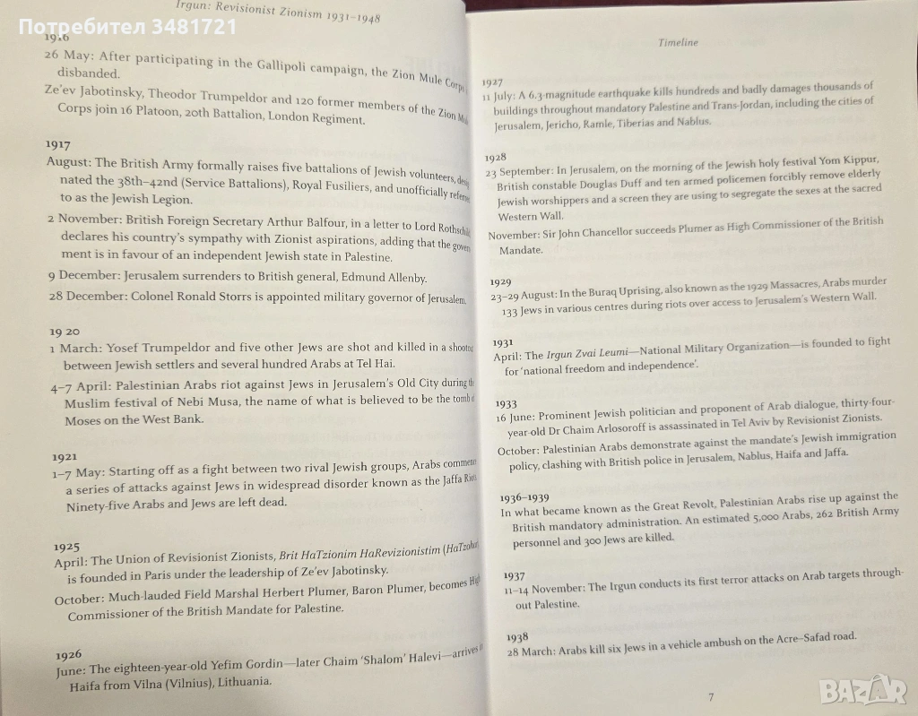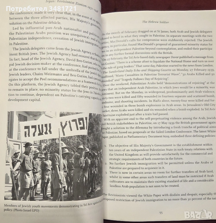 Авторът разглежда подробно, в текст и исторически фотографии историята на Иргун. През 1925та година Зеев Жаботински основава организация за ревизионистки ционизъм, чиято светска, дясна идеология ще доведе до формирането на Иргун, а след време и на партията Ликуд. Започвайки операции в британския мандат на Палестина през 31ва година, Иргун поема предимно охранителна роля, като същевременно улеснява продължаващата имиграция на евреи в Палестина. През 36та година, партизаните на Иргун започват да атакуват арабски цели. Британската Бяла книга от 1939та година отхвърля създаването на еврейска нация и като пряко следствие от това, партизаните на Иргун започват да атакуват британците.