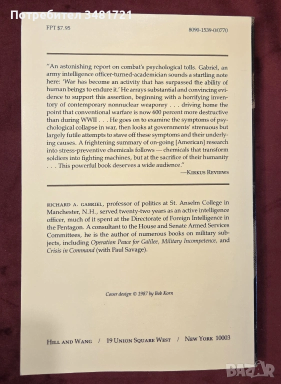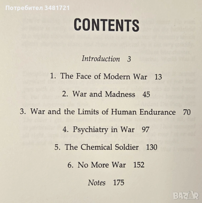 Авторът Ричард Гейбриъл, бивш офицер от разузнаването, проследява в тази книга историята на лудостта във войната, поведението на мъжете в бойни условия и как това променя казусите в съвременните армии и военни действия. За него, войната е действие, което е отвъд менталните възможности за издръжливост на съвременните мъже. Той предлага доказателства как днешните въоръжени конфликти са 600 процента по-разрушителни дори от тези през Втората световна война, използвайки неядрени оръжия, в комбинация с анализ на признаците за психологически колапс при войниците и безуспешните опити на правителствата да тушират тези симптоми и първоизточниците им. Това е аналитична история на разрухата на човешката психика във война, която включва също химическите медикаменти, които армиите използват, за да намалят стреса на войниците, превръщайки ги в ефективни, бойни машини, но принасяйки в жертва, по този начин, тяхната хуманност. Последното е действие, което често е необратимо.