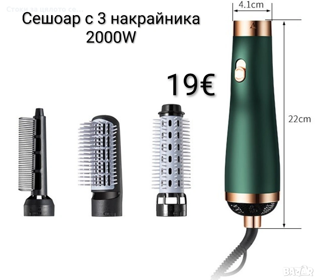 Сешоар с три накрайника, 3 степени на мощност, използва горещ въздух