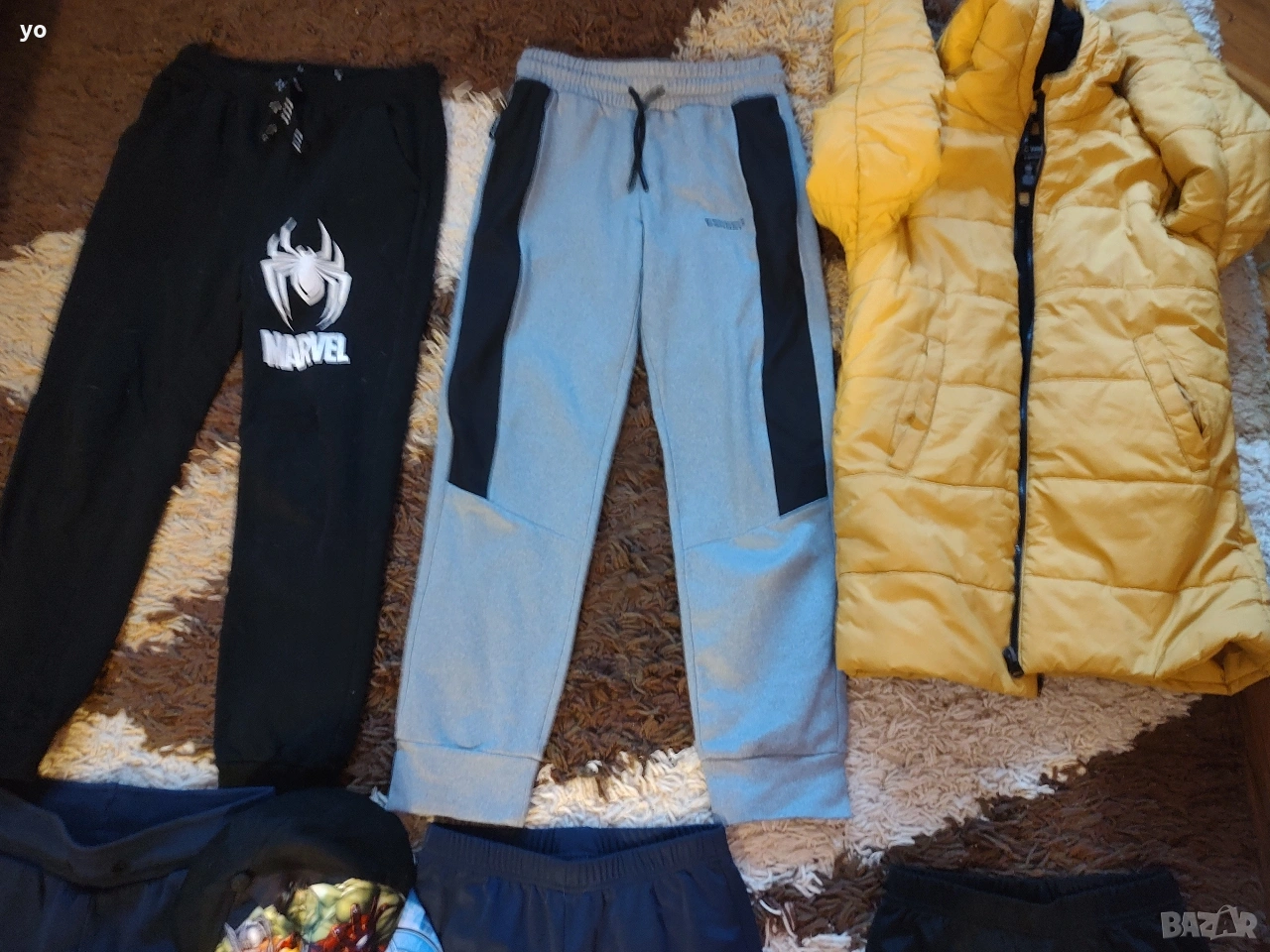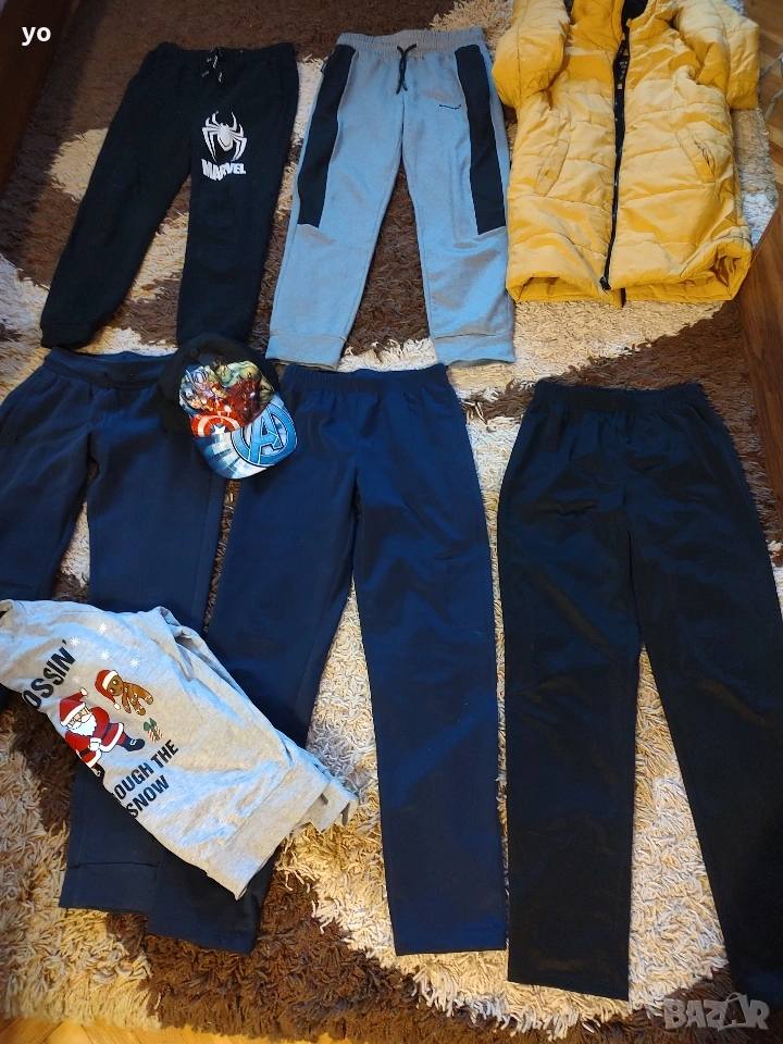 Един голям кашон с детски дрехи размер 128 но има и 134 всички дрехи са в добро състояние единствено жълтото зимно яке има надраскано от химикал.