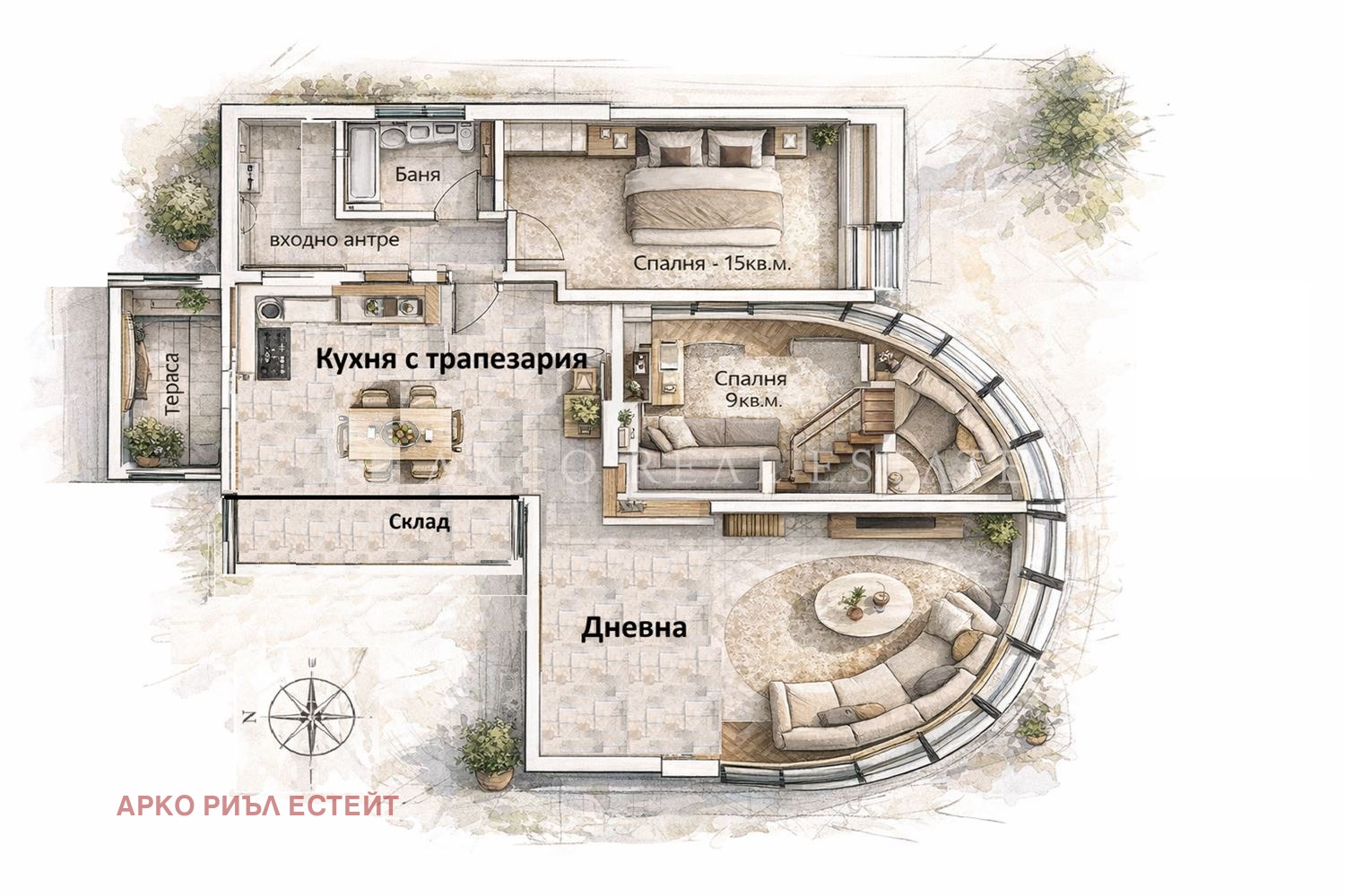 Етаж 1: Огромна дневна, Кухня, Спалня, Баня с тоалетна, Тераса и Склад.
