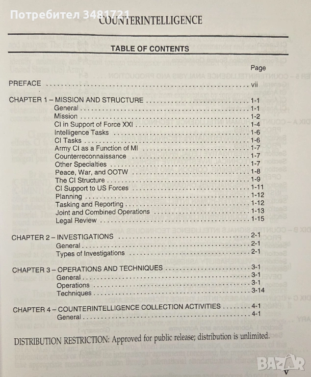 Официалното декласифицирано ръководство, издадено от Department of the Army, предназначено за командири, контраразузнавателни агенти и анализатори. Контраразузнаването, по своята същност, изисква мултидисциплинарен подход. То включва човешко контраразузнаване (C-HUMINT), сигнално контраразузнаване (C-SIGINT) и визуално контраразузнаване (C-IMINT), целящо да неутрализира вражески опити за събиране на информация.