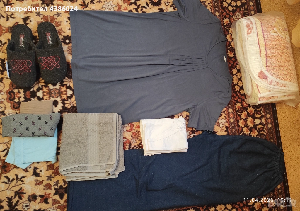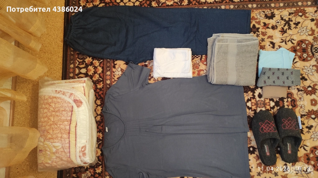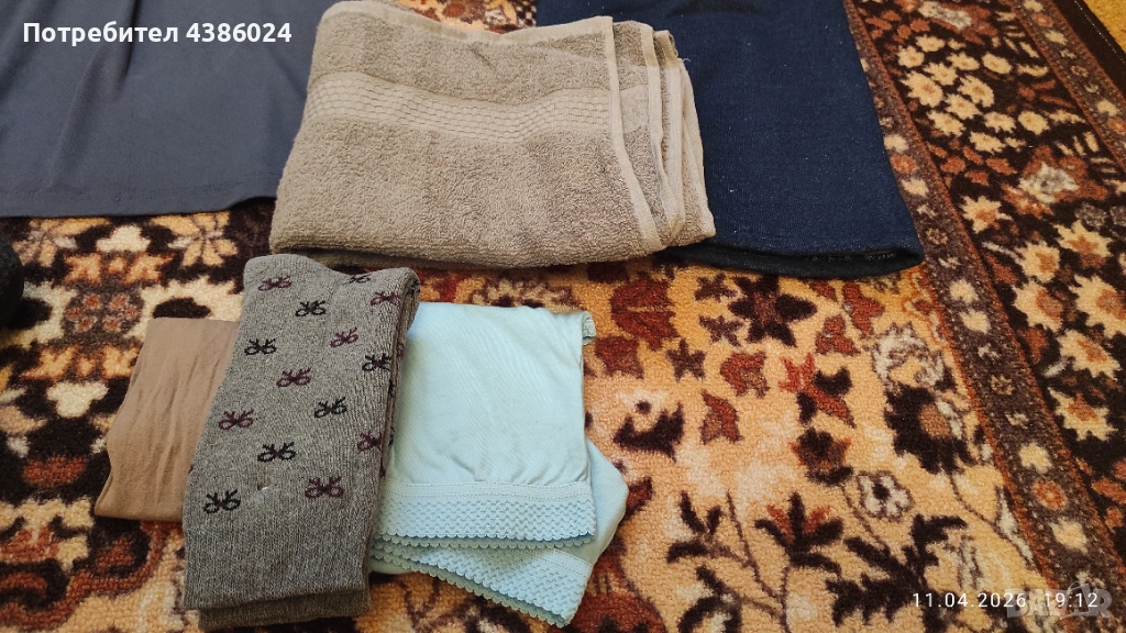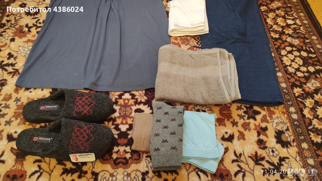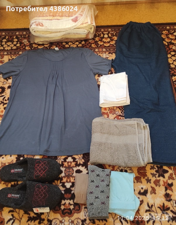 ЛОТЪТ ВКЛЮЧВА: КАМИЗОЛА, ЧЕХЛИ СИВИ ТУРСКИ Н. 39, ЧОРАПИ, ДЕБЕЛО ДОЛНИЩЕ НА АНЦУГ, ПАМУЧНА ТЪМНОСИВА БЛУЗА, ШАЛТЕ РАЗМЕР 120/180, ХАВЛИЕНА КЪРПА ТЪМНОСИВА.