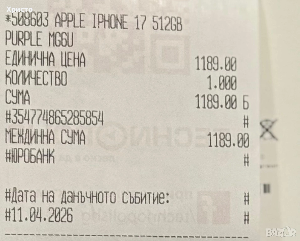 Телефонът е чисто нов, неразпечатан и никога не е използван. Намира се в оригиналната си фабрично запечатана кутия. Закупен е на 11.04.2026 г. и разполага с 24 месеца гаранция към Технополис. Работи с всички оператори и е напълно отключен.