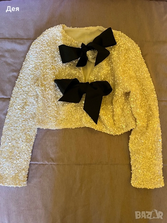 Бяла блуза с пайети и панделки от Shein. Носена е веднъж за повод.