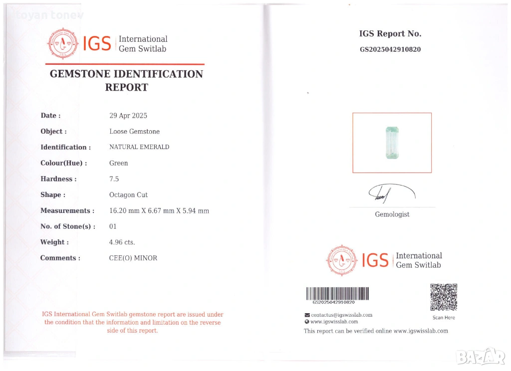 Произход: Колумбия – родината на най-красивите изумруди в света Сертификат: Официален IGS Gem Switlab – април 2025 г.