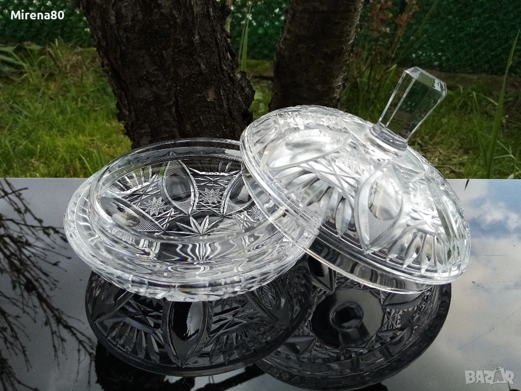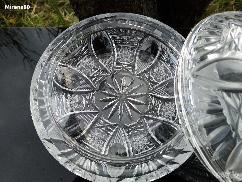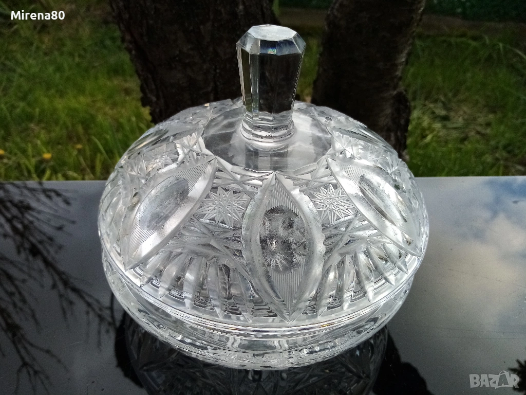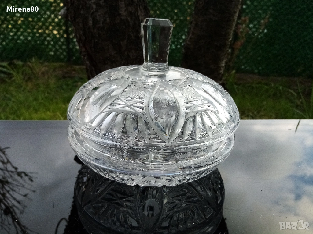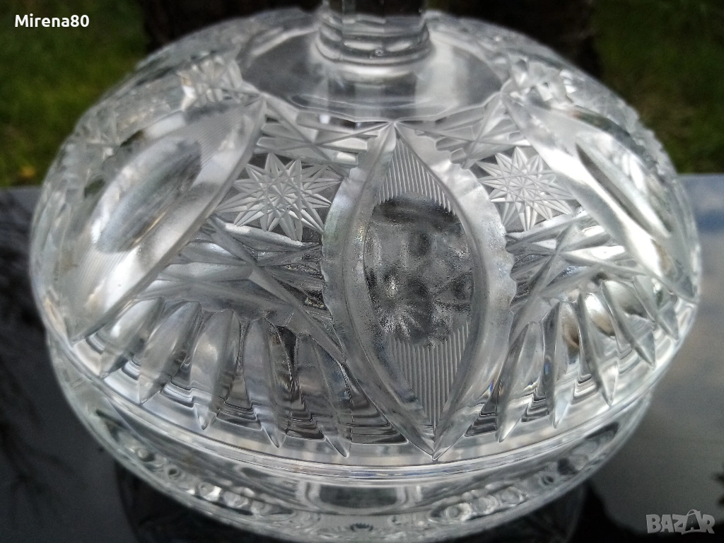Голяма бонбониера с капак - производство Чехословакия от миналия век. Тежка, масивна, страхотен оловен кристал. Изключително богато гравирана - на живо отразява светлината по уникален начин. Ръчна изработка ! Тегло - 1720 гр, вис. 15, диам. 18 см. Отлично състояние !