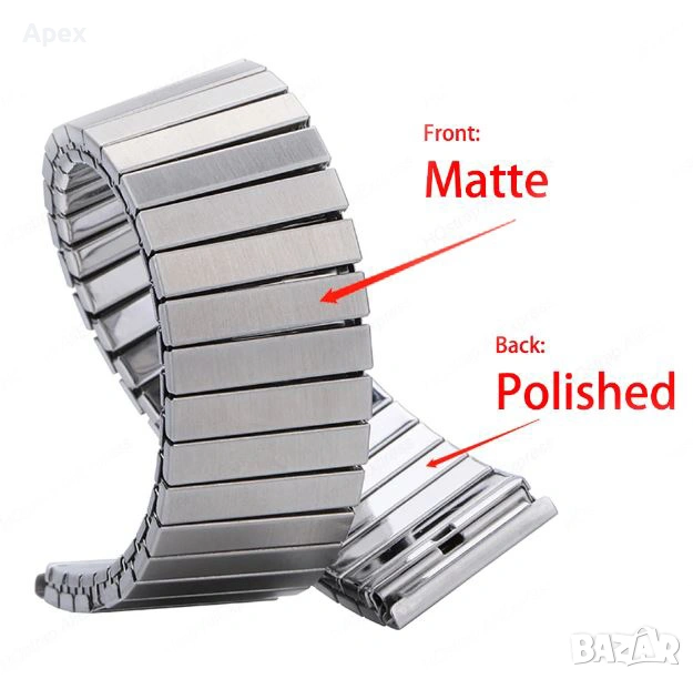 Ширина: 12мм, 14мм, 16мм, 18мм, 20мм, 22мм, 24мм, 26мм, 28мм. Възможност за лесно скъсяване. Разполагаме с модели с матови (Brushed) и полирани (Polished) звена, солидни звена (Solid links) и различни оплетки.