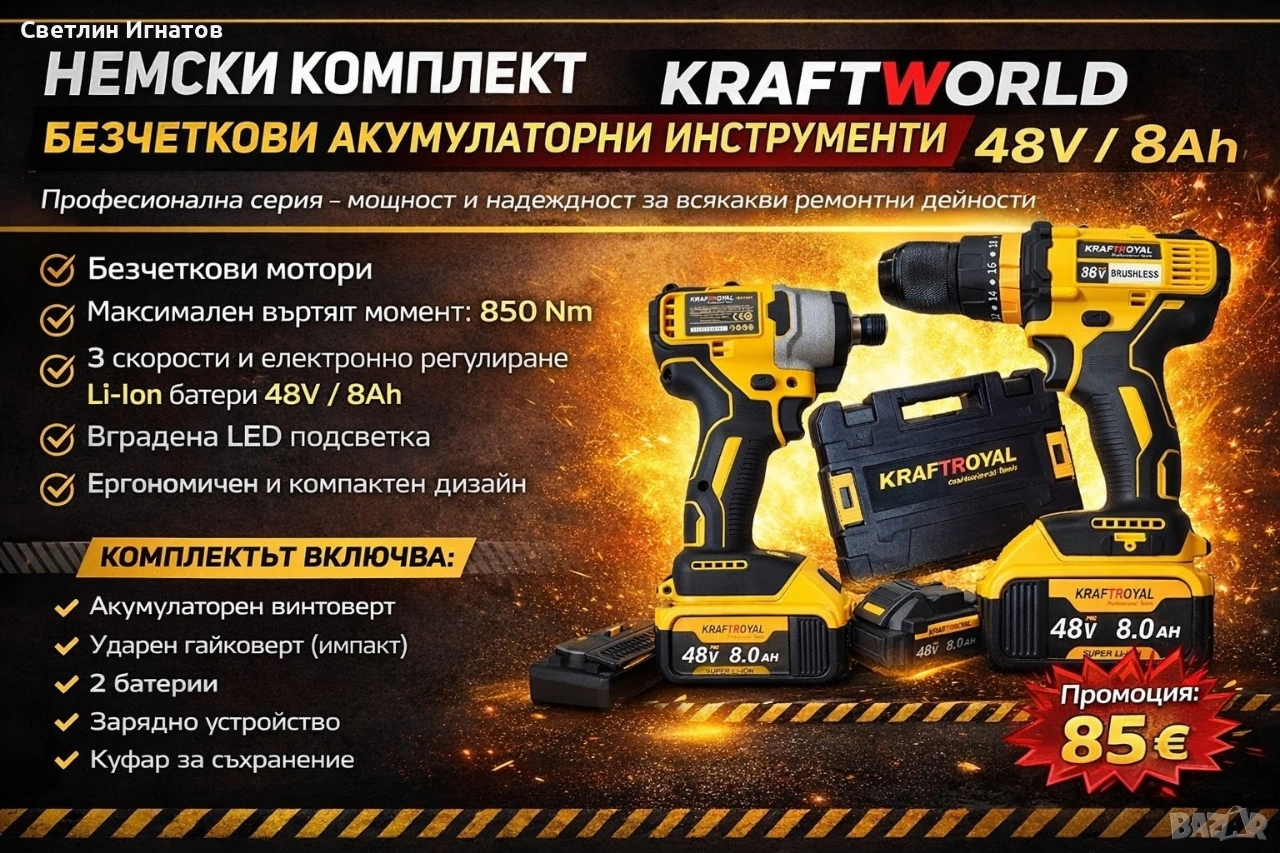 Представяме Ви мощния комплект KRAFTWORLD 48V / 8Ah – безчетков винтоверт + ударен импакт, създадени за сериозна работа!