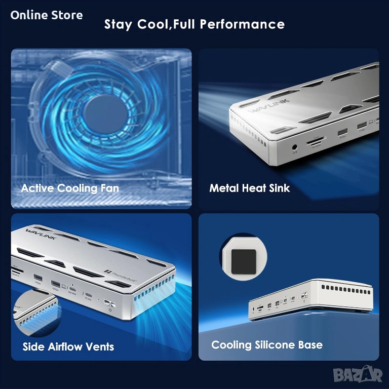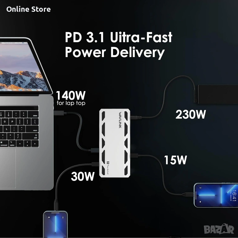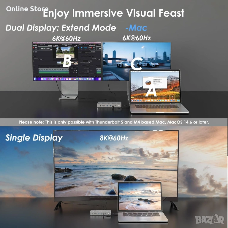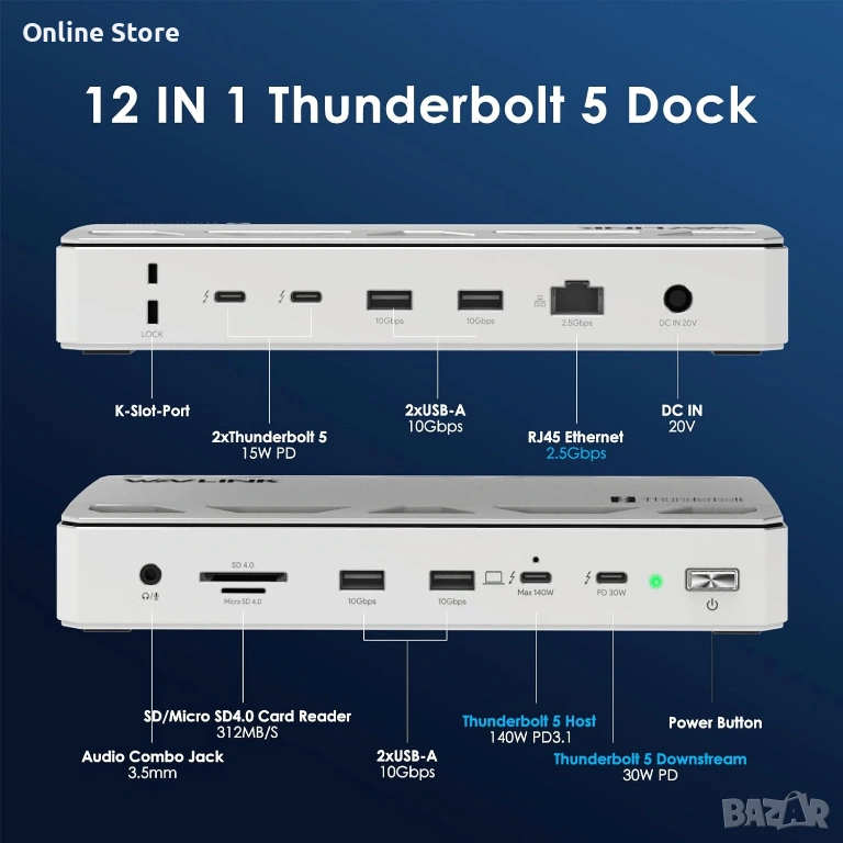 Мощна докинг станция за бърза, подредена и професионална работна среда. Подходяща е за лаптопи и компютри с Thunderbolt 4 или 5, като дава възможност за свързване на няколко дисплея, високоскоростен трансфер на данни, стабилен интернет и удобен достъп до всички важни портове в едно устройство. Идеален избор за офис, дизайн, видео обработка и натоварена ежедневна работа. Моделът е с английски щепсел, като предлагаме европейски преходник на цена 2 евро