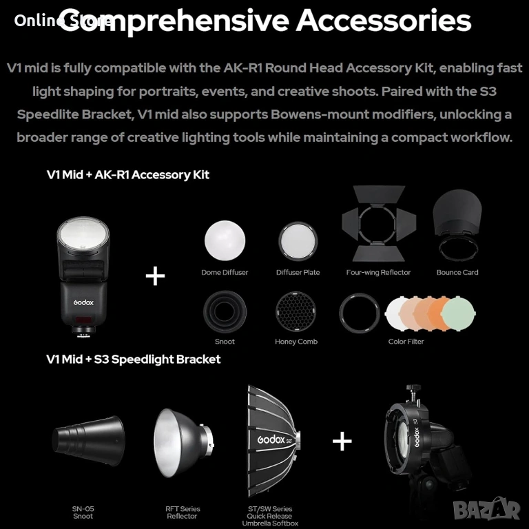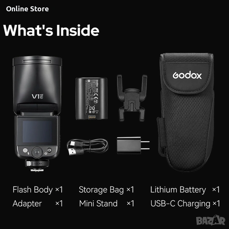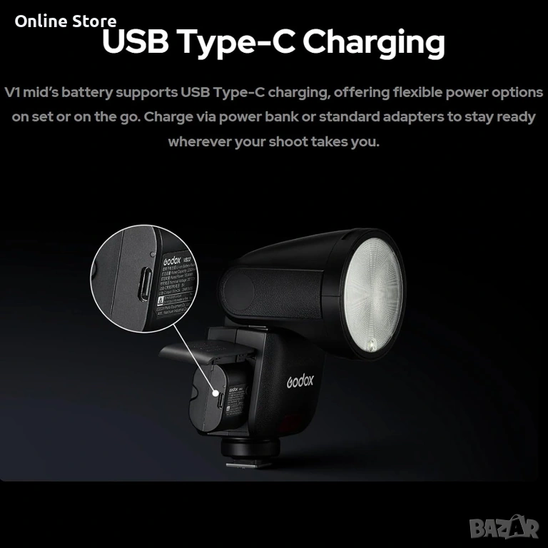 Godox V1 Mid C TTL светкавица за Canon – кръгла глава, LED лампа, 2.4G wireless