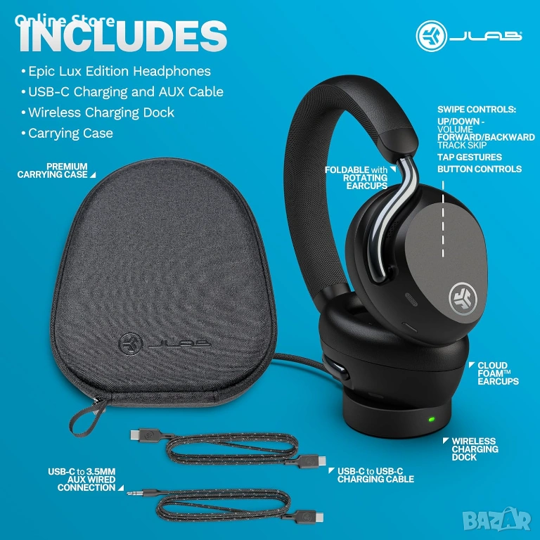 - Меки наушници, сгъваем дизайн и удобен калъф за носене