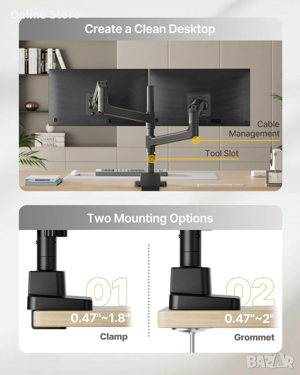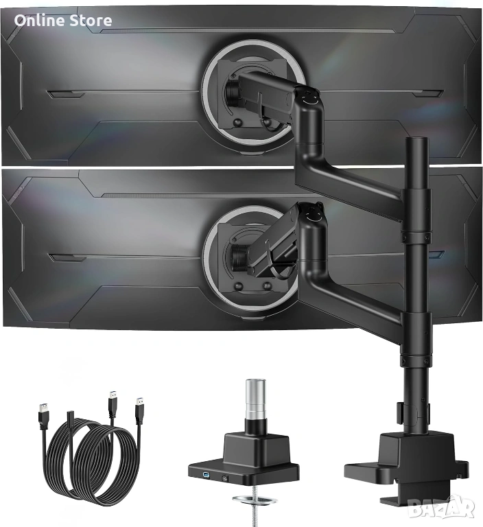 Стабилно и професионално двойно рамо за монитори, създадено за по-подредено бюро, повече комфорт и по-добра ергономия при работа или гейминг. Подходящо е за големи и ултрашироки екрани, включително извити модели, като позволява лесно и плавно регулиране според вашата позиция. Отличен избор за офис, трейдинг, програмиране, дизайн и мултимониторни конфигурации.