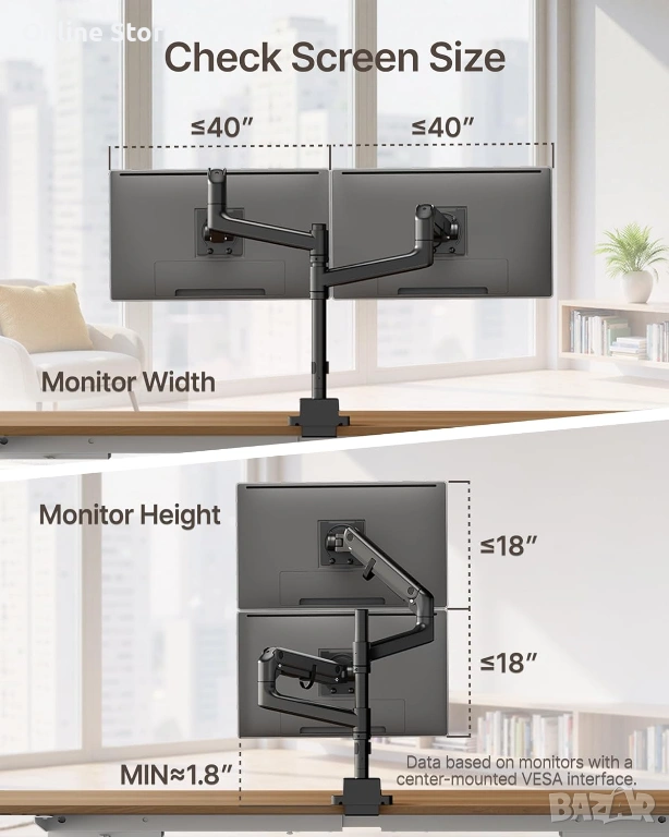 - Поддържа два монитора от 17" до 57" с общ товар до 27 кг