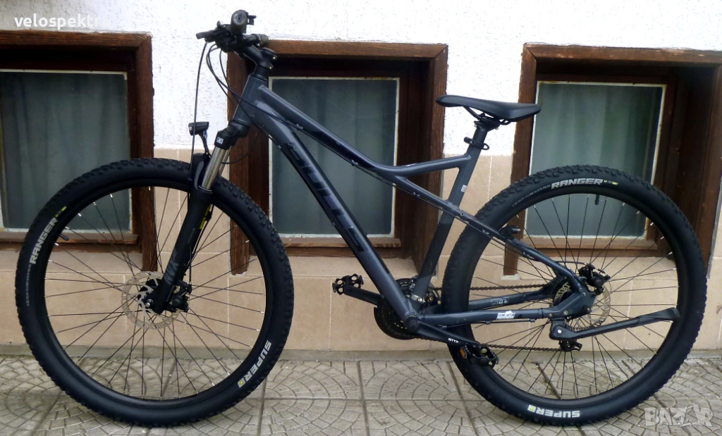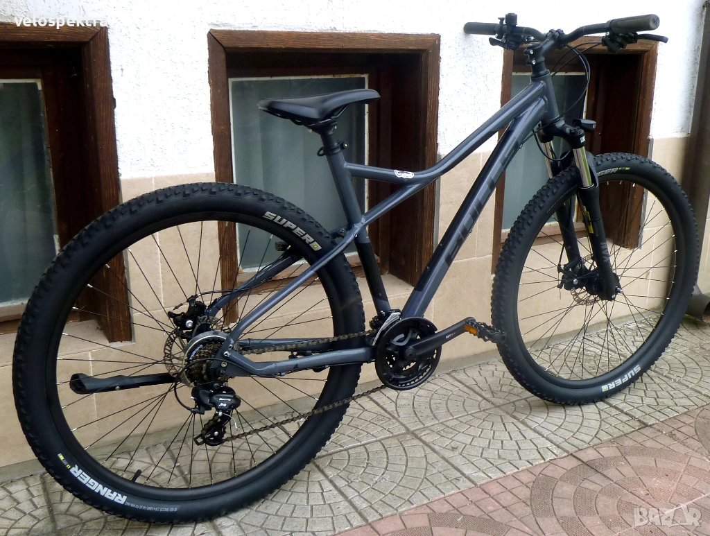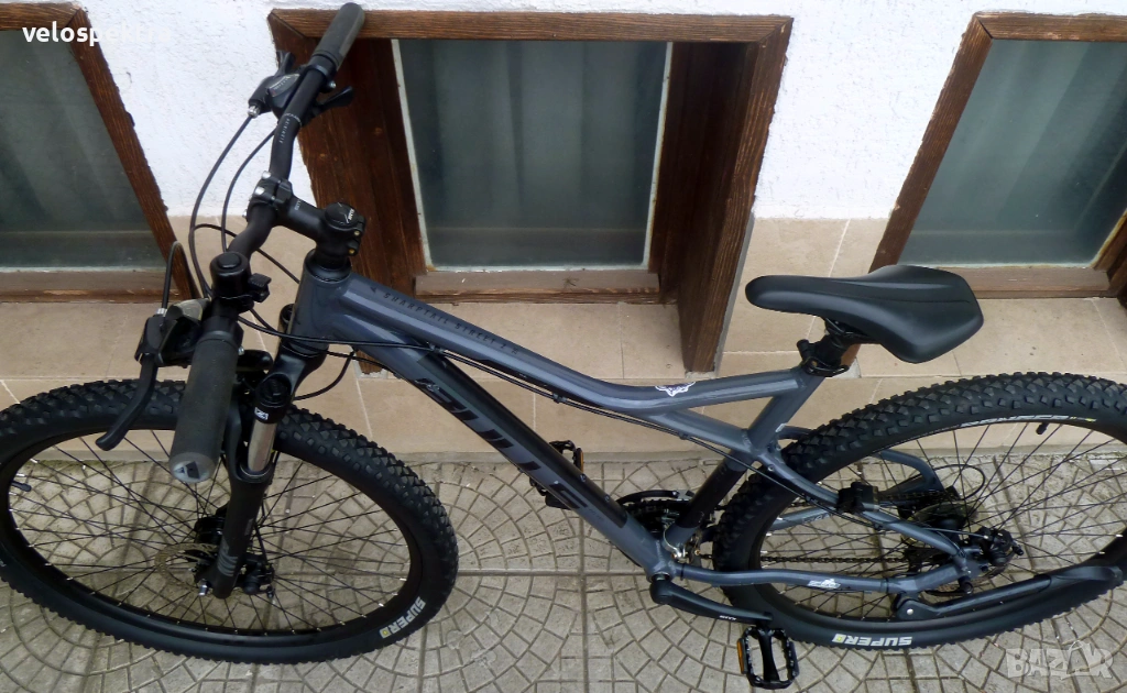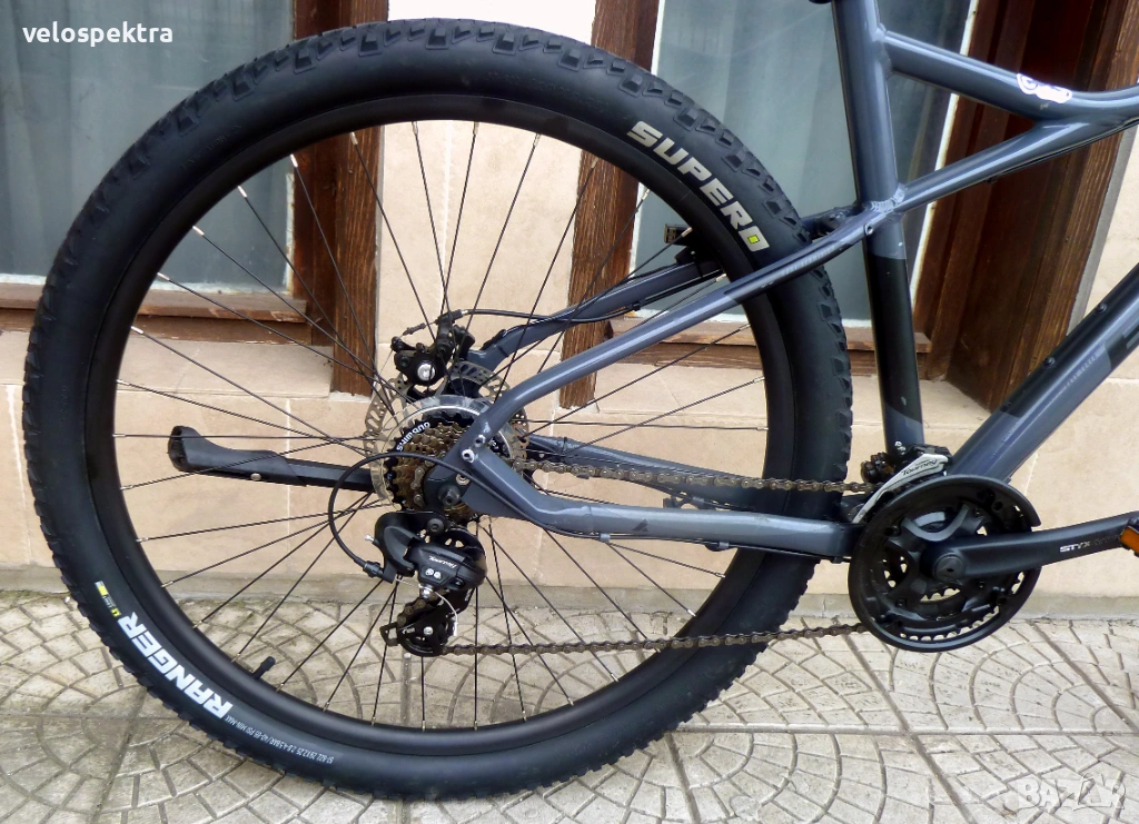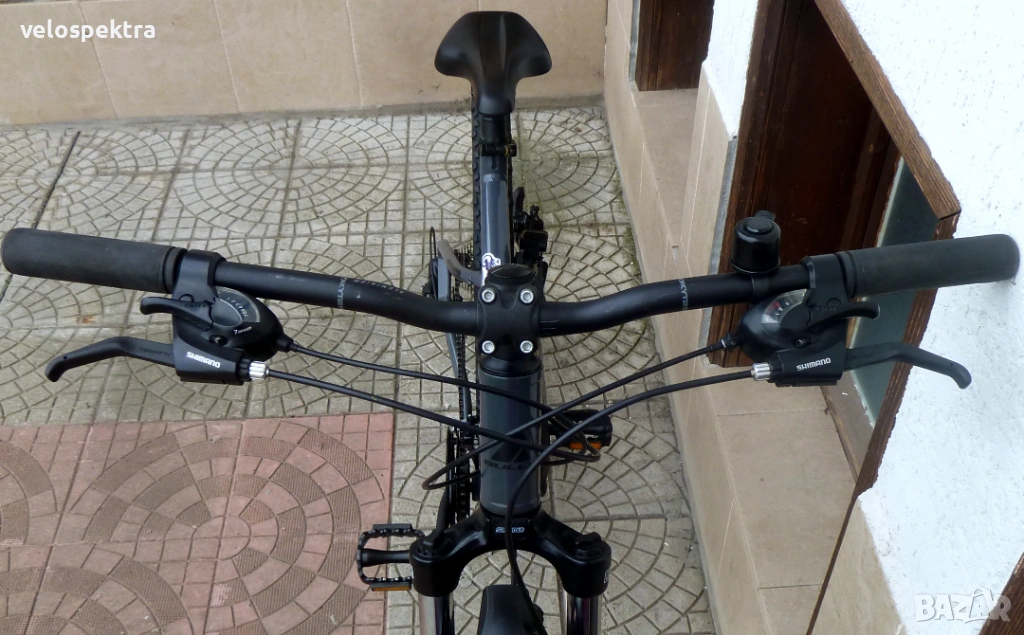 3х7 скорости Шимано , палцови команди 3х7 Шимано . Две дискови Механични спирачки диск 160/160 . Степенка.