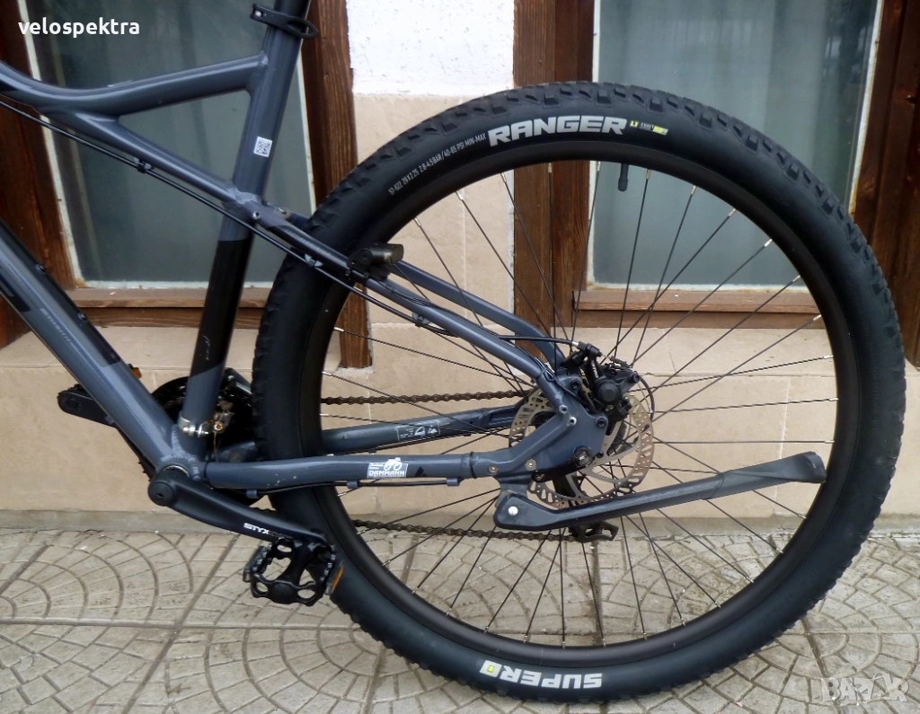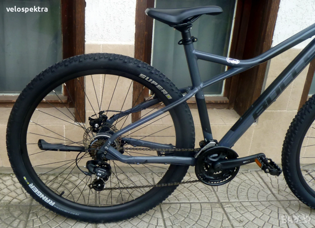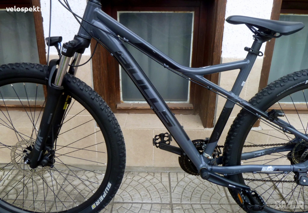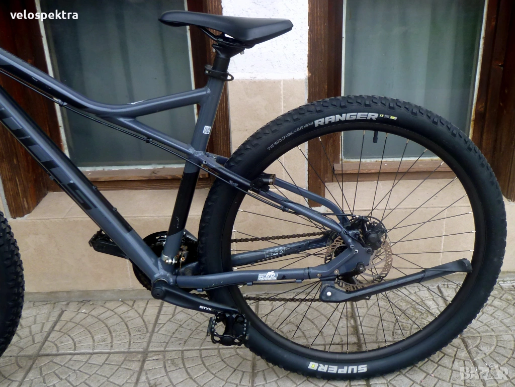 3х7 скорости Шимано , палцови команди 3х7 Шимано . Две дискови Механични спирачки диск 160/160 . Степенка.