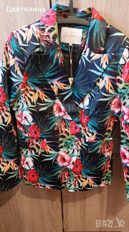 Нов, страхотен костюм в свежарски цветова. Основният цвят е черен, материята е леко сатенирана.