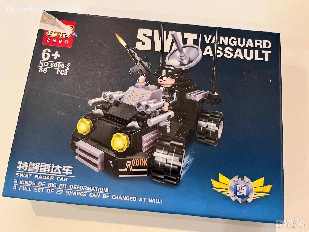 Реплика на Лего. С наличните части могат да се създадат два вида коли и една лодка. Развива творческата мисъл в децата!