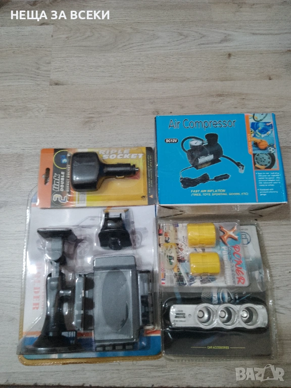 Компресор за гуми, стойка за телефон, двойно зарядно за запалка, зарядно с юсб за телефон и държач за кабели. Комплекта се продава целия. Цената е за всичко. Изпращам с Еконт, за сметка на получателя с опция отвори и провери.