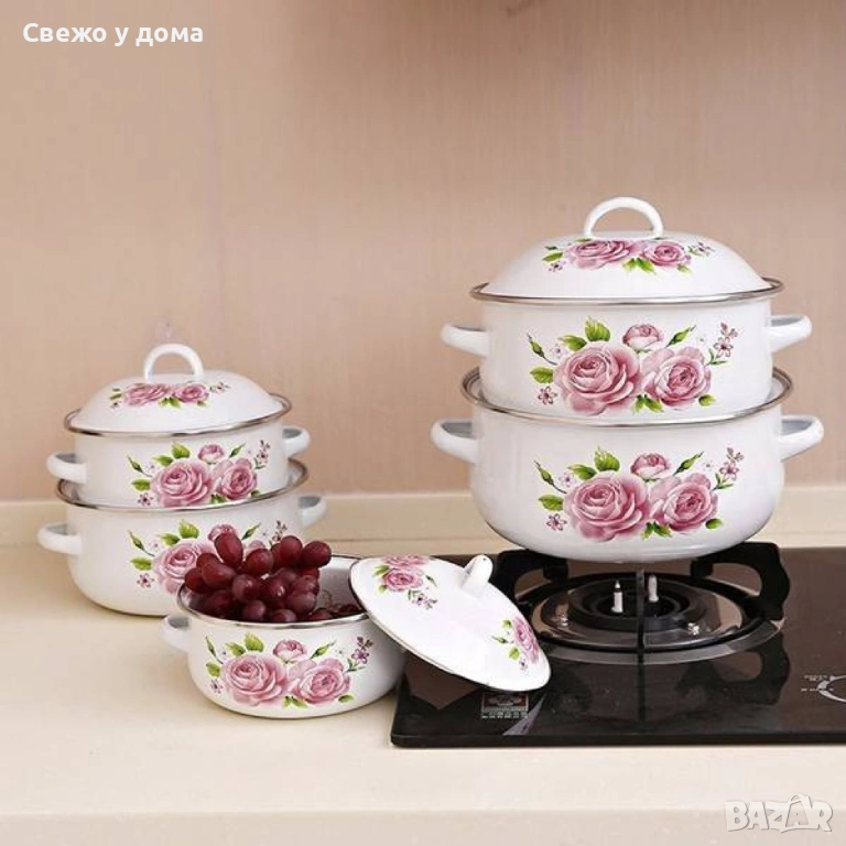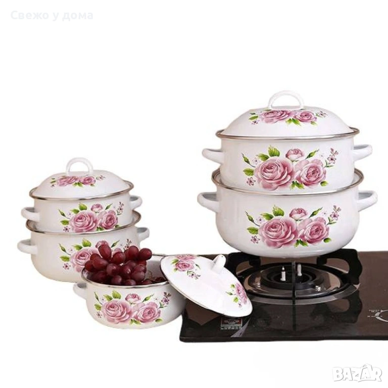 Съдовете са с качествено емайл покритие, могат да се използват върху керамични и др. готварски плотове, подходящи и за електрически и газови печки.