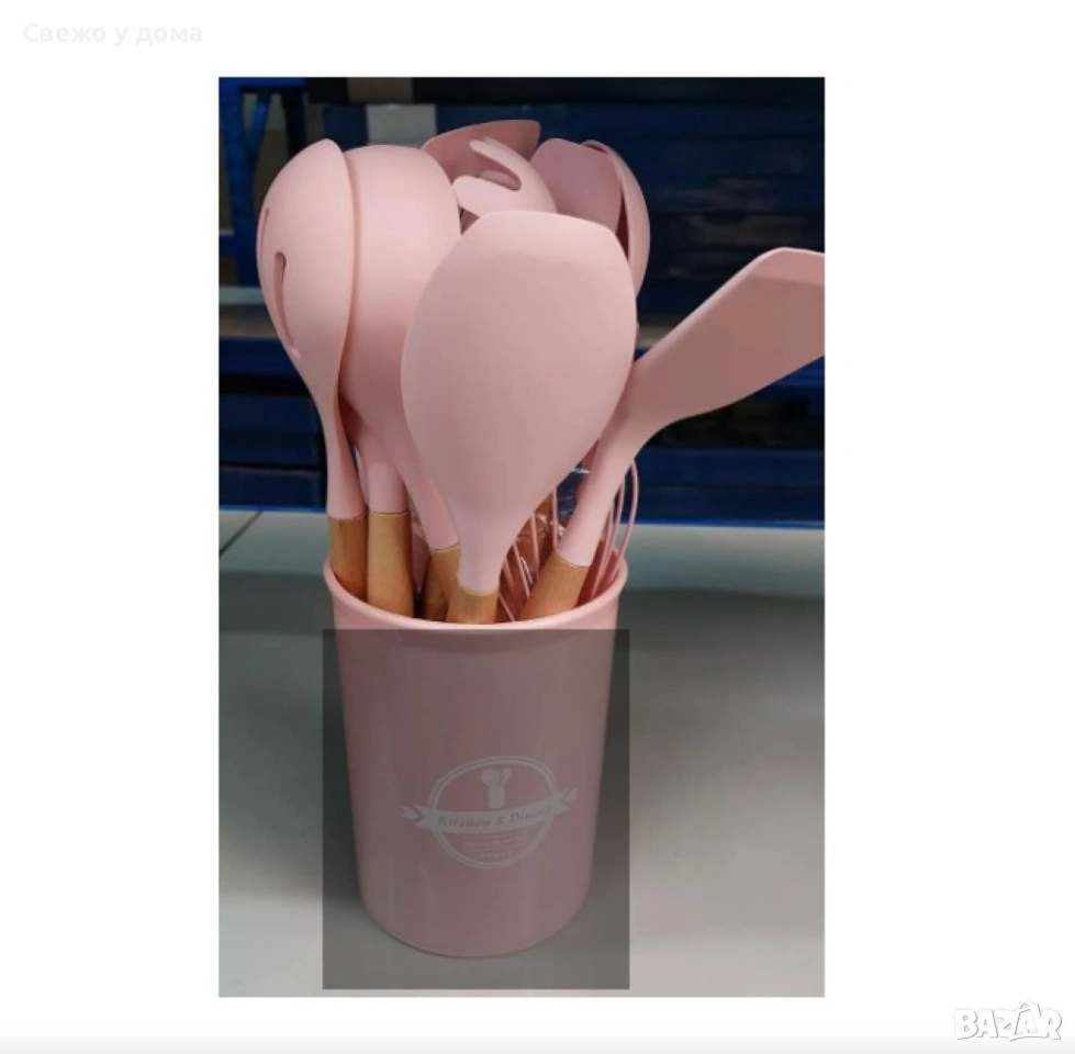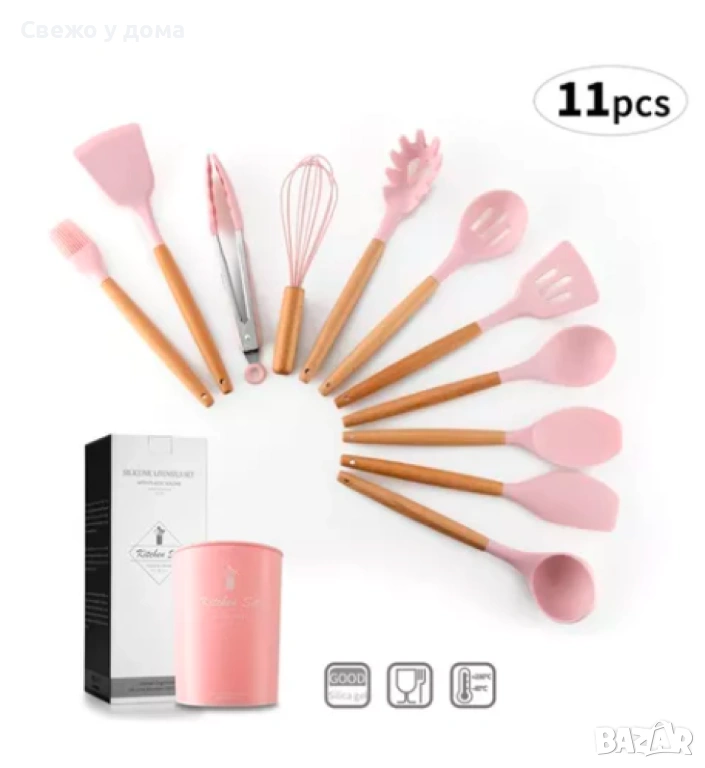 Комплект кухненски прибори 11 бр. в кръгла поставка. ВАРИАНТИ: НЕЖНИ И ПРАКТИЧНИ ЦВЕТОВЕ. Материал: силикон с дървени дръжки. Този комплект представлява идеалния спътник за вашата кухня, като комбинира стил, функционалност и издръжливост в едно. Всеки от приборите е създаден с внимание към детайлите и изработен от висококачествен силикон, който е безопасен за хранене, лесен за почистване и не надрасква вашите тигани и тенджери. Дървените дръжки придават на всеки инструмент топлина и естетика, правейки ги подходящи както за професионални готвачи, така и за любители на кулинарното изкуство.