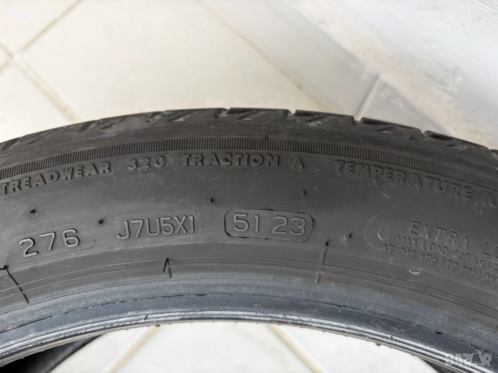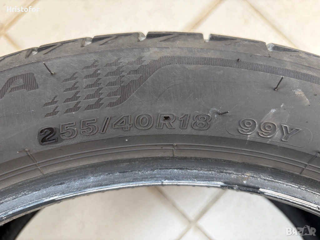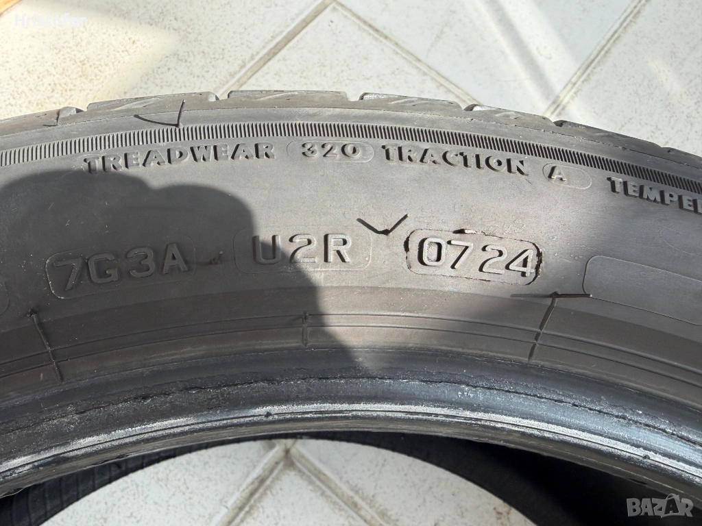 Комплект летни гуми - Bridgestone Turanza T005 (звездичка) хомологация BMW. Предни 225/45 R18 95Y, дълбочина на грайфера - 4.9 мм, ДОТ 5123. Задни 255/40 R18 99Y, дълбочина на грайфера - 5.2 мм, ДОТ 0724. На едната задна има лепенка, вижда се на снимката. Без фитили и балони. На около 20000км. Изключително комфортно и тихо поведение на пътя. Грайферът е равномерно износен, което гарантира липса на вибрации и шум. Продават се само в комплект.