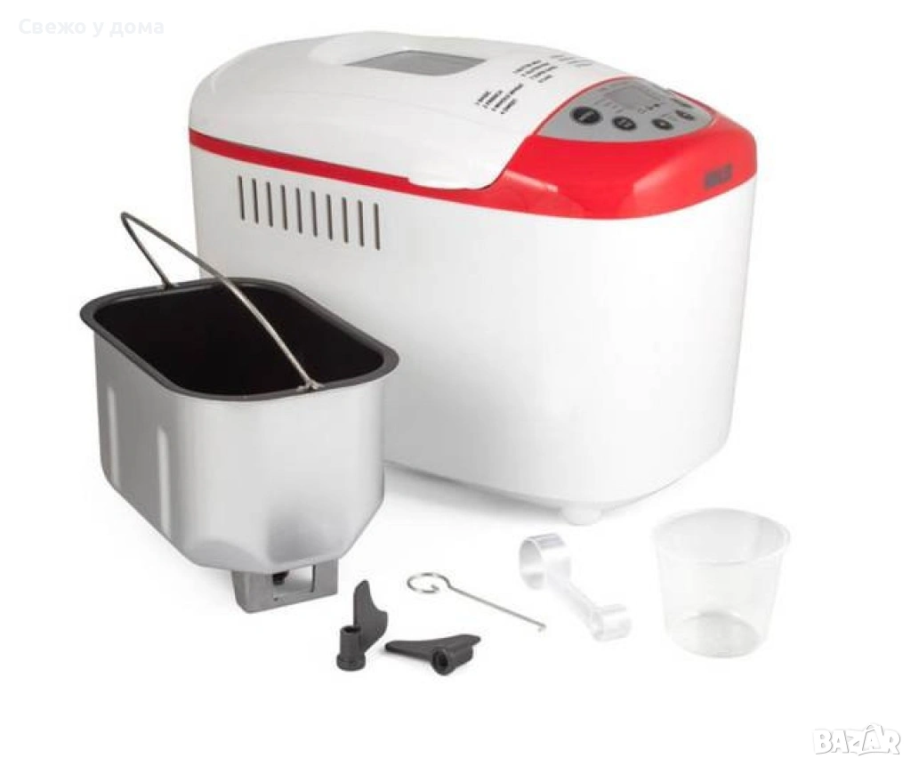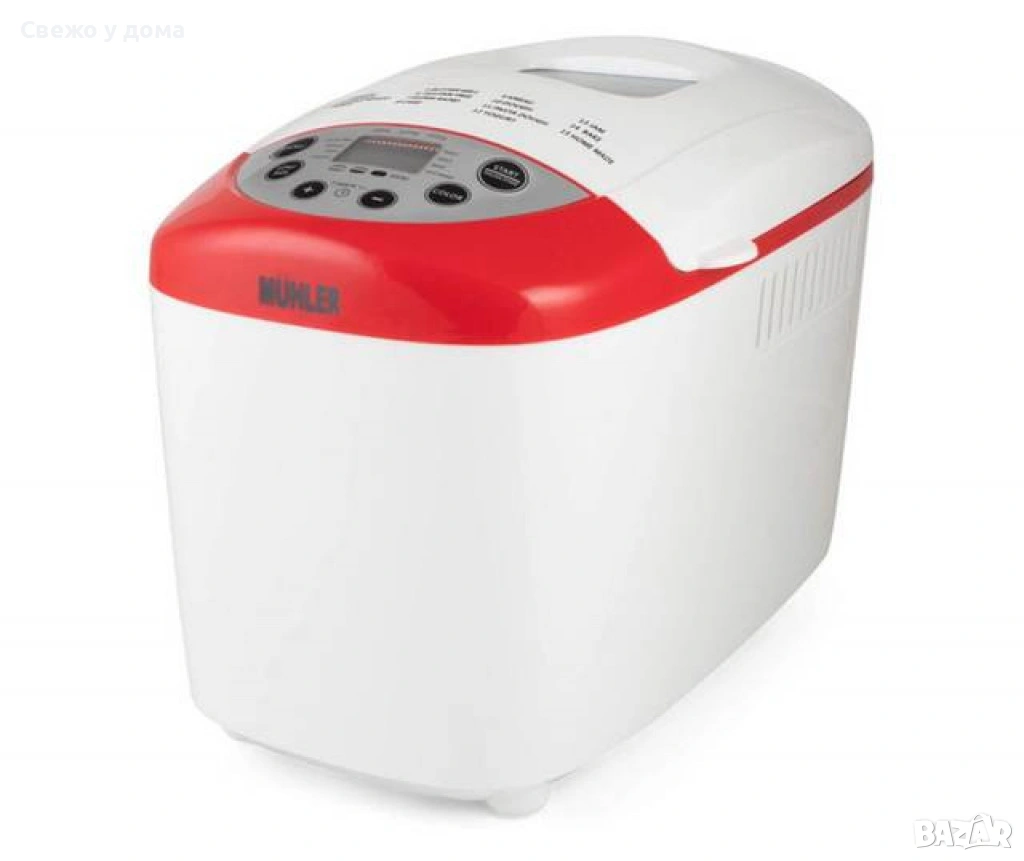 Хлебопекарната е идеален избор за всеки, който иска да се наслаждава на прясно приготвен хляб у дома. Благодарение на своите разнообразни функции и елегантен дизайн, тази хлебопекарна е практичен и стилен помощник във всяка кухня. Хлебопекарна MBM-1502, бял- червен, две бъркалки,650585 Размера на хляба 1000 г/1250 г/1500 г Топло изолиран корпус. LCD дисплей. 15 програми основна, френски хляб, пълнозърнест, сладък, млечно- маслен хляб, безглутенов, бърза, кекс, бъркане, замесване на тесто, тесто за паста, йогурт, мармалад, печене, домашен хляб (ръчна настройка). 2 бъркалки за по-голяма ефективност на месенето. Съд за печене и бъркалки с не залепващо покритие.