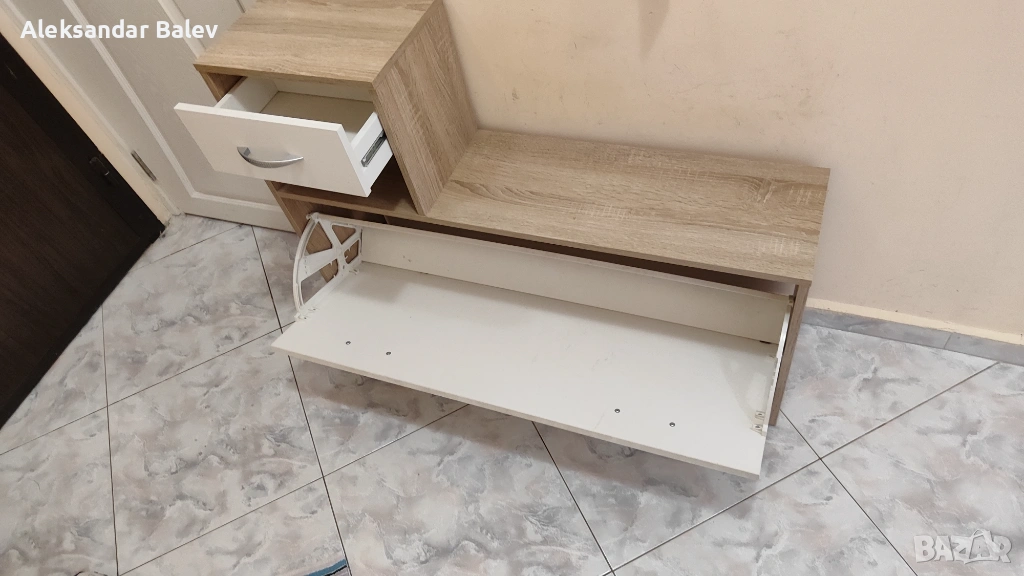 Дълъг шкаф с падаща бяла вратичка, подходящ за съхранение на обувки (около 4-6 чифта) или други аксесоари.