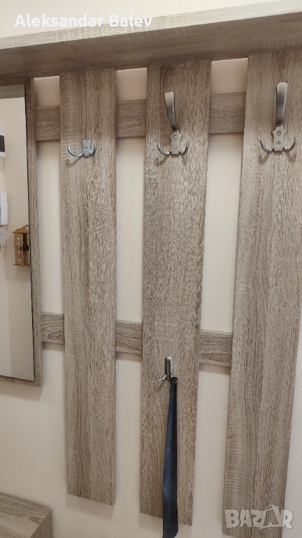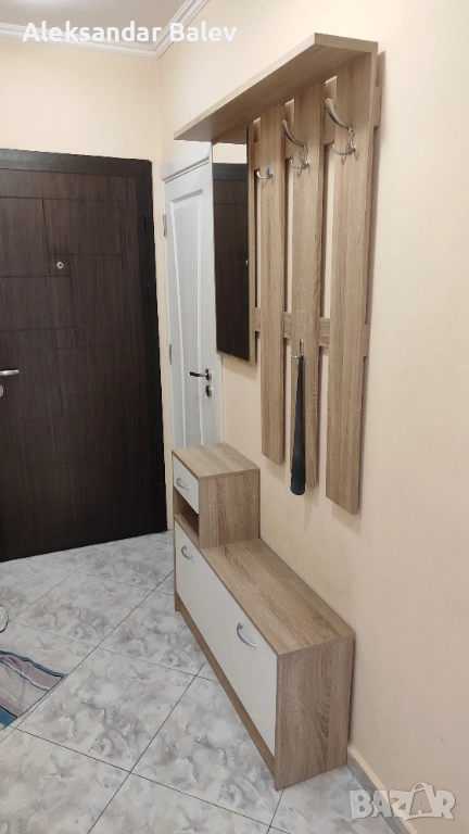 Продавам компактно и много функционално портманто, идеално за малки или средни коридори. Комбинацията от дървесен декор (светъл дъб/сонома) и бели мат акценти е модерна и визуално разширява пространството.