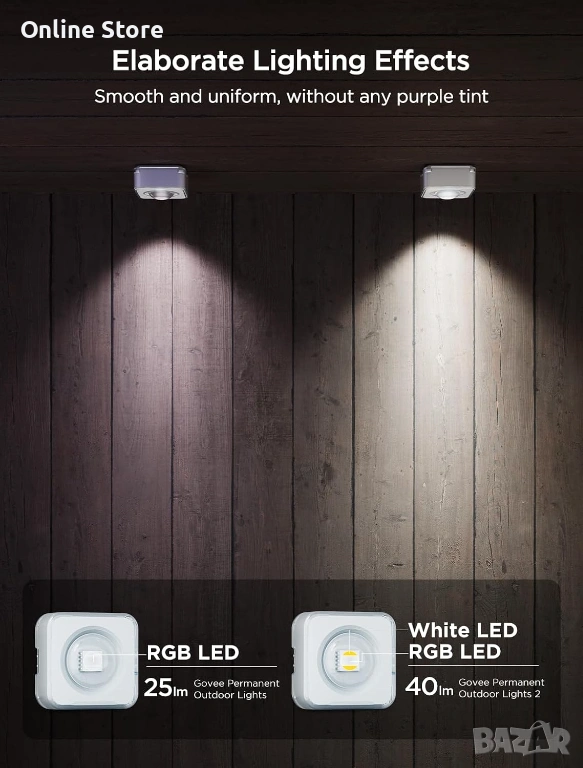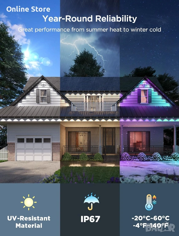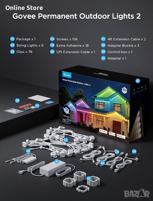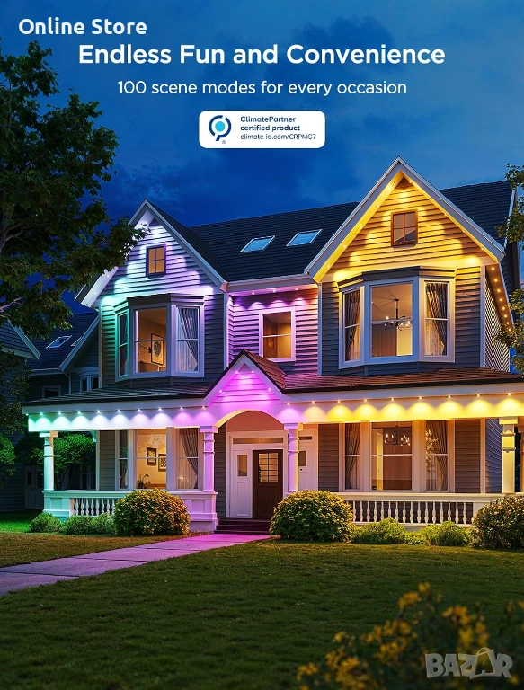 Ефектно външно осветление за дом, двор, тераса, фасада или празнична декорация. Създава ярка и впечатляваща атмосфера с богати цветове, готови сцени и удобно управление през телефон или с гласови команди. Подходящо е за целогодишна употреба на открито, благодарение на здравата защита срещу вода и атмосферни условия. Моделът е с английски щепсел, като предлагаме европейски преходник на цена 2 евро.