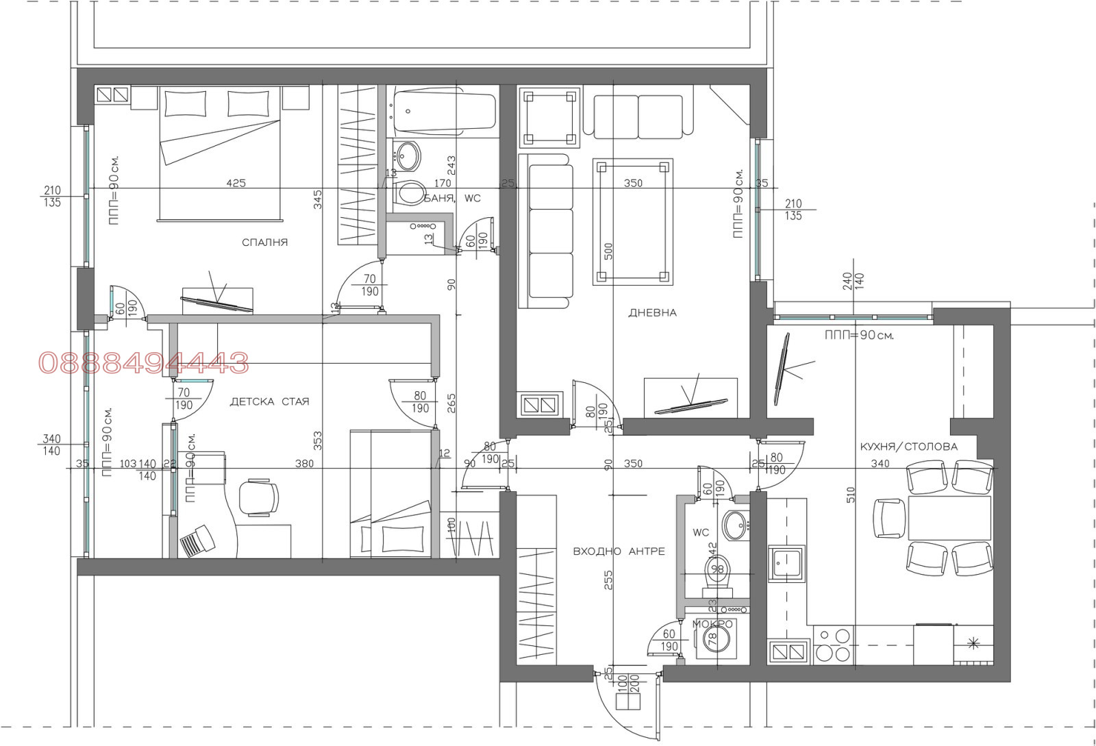 ( застроена площ) по нотариален акт от 93,00м2 (без общите части, терасите и мазето), общо 118 м2. Намира се на четвърти етаж в осем етажна жилищна сграда тип ПК от 1990 те години, с изградено видеонаблюдение, асансьор, сменена дограма и поддържани общи части В цената е включено мазе с площ 3,65 м2 и 4,42% общи части на сградата, както и цялото обзавеждане, мебели и уреди.
