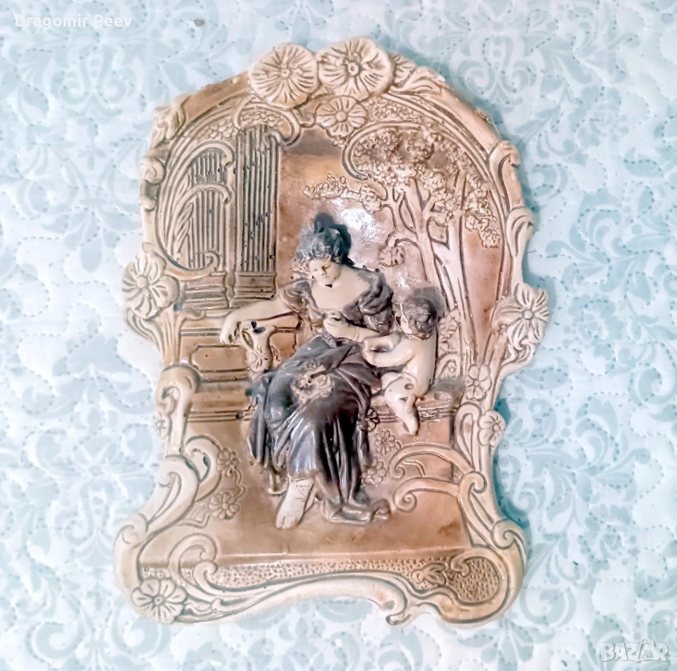 Продавам автентично декоративно пано (барелеф), изработено с изключително внимание към детайла. Предметът изобразява класическа антична сцена в градина с архитектурни елементи (йонийски колони) и фигура на жена с дете (Купидон/Младенец). Изработката е в характерния за средата на XX век стил, съчетаващ гипс и предпазно лаково покритие, което придава дълбочина на цветовете.