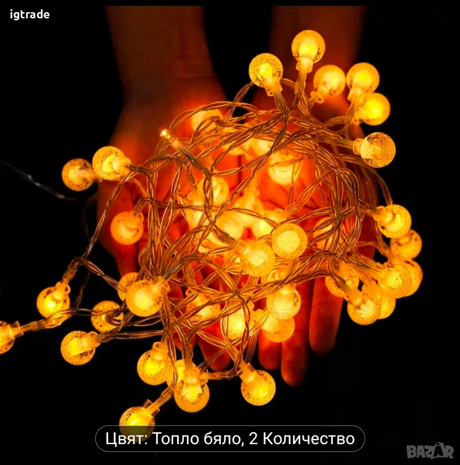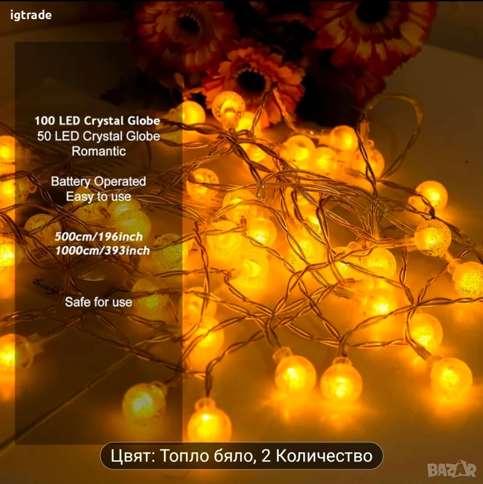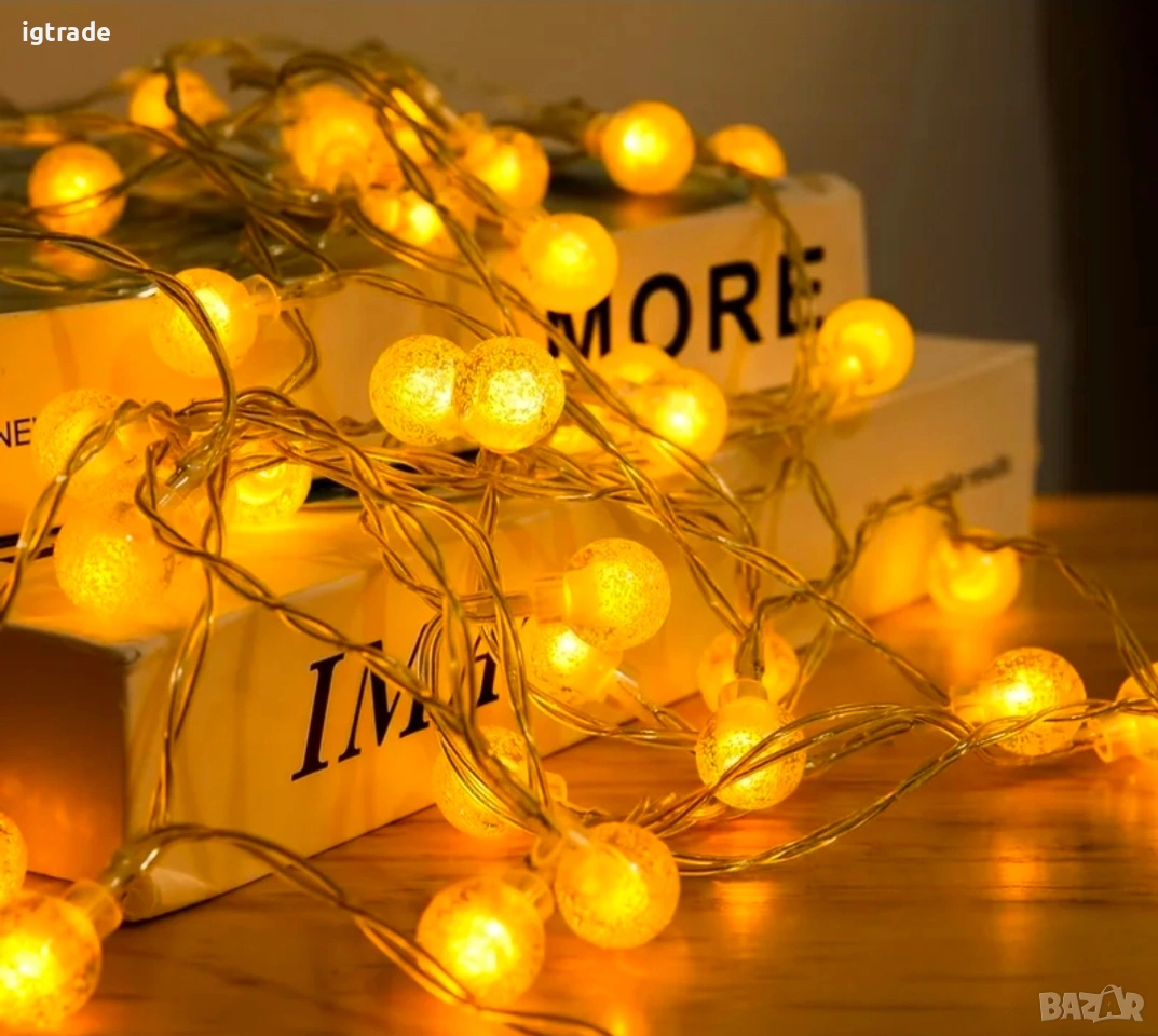Артикулът е чисто нов, в оригиналната си опаковка. Практична и удобна LED декоративна гирлянда с дължина 10 метра, подходяща за украса на дом, тераса, детска стая, празници, партита и различни декорации. Работи с 3 x AA батерии, което я прави много удобна за използване на места без нужда от контакт. Предимства: - дължина 10 метра - работи с 3 x AA батерии - лесна за поставяне - подходяща за различни видове декорация - удобна за използване у дома, на тераса, за събития и празници Подходяща за: - домашна декорация - празнична украса - украса за детска стая - парти декорация - сезонни аранжировки За поръчка: - две имена - населено място - офис на куриер или адрес (Econt или Speedy) - телефонен номер