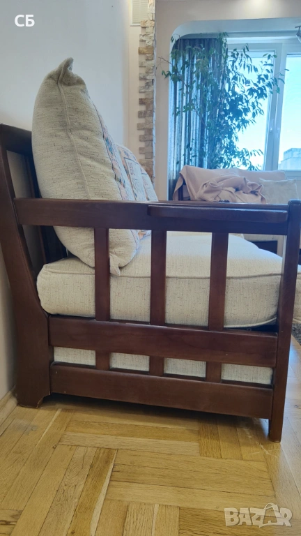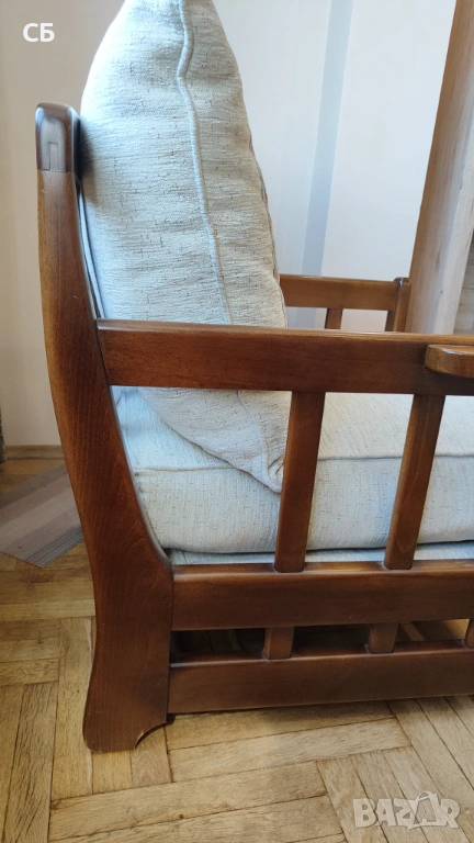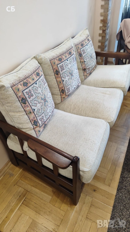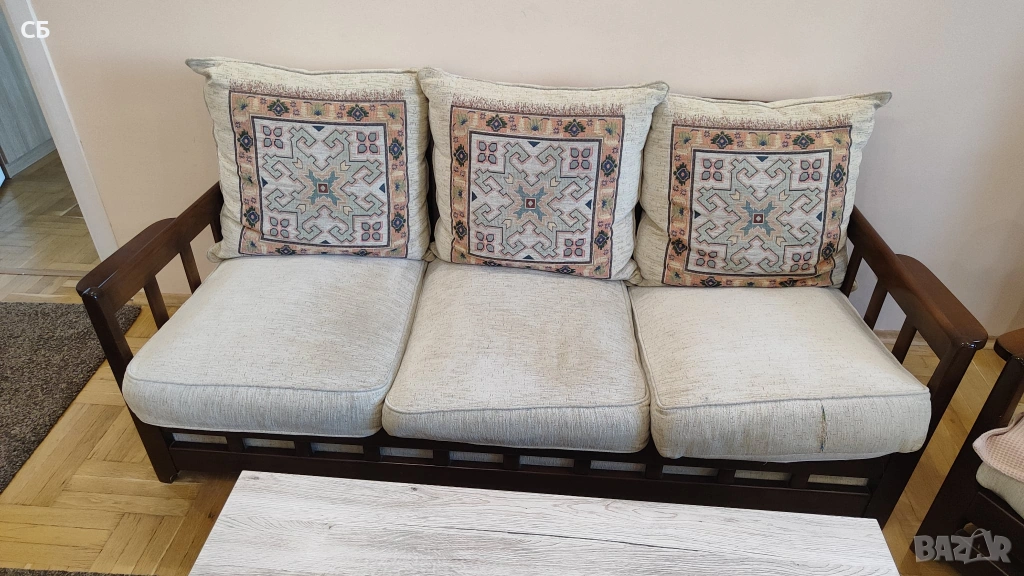 Дървена ретро холова гарнитура в три части - разтегателен диван, диван двойка и фотьойл. Подходяща за вила, селска къща или за хол във винтидж стил. Основата, краката и страниците са от масивно дърво (бук). По дамаската има забележки, но възглавниците лесно могат да се претапицират. Големият диван е разтегателен.