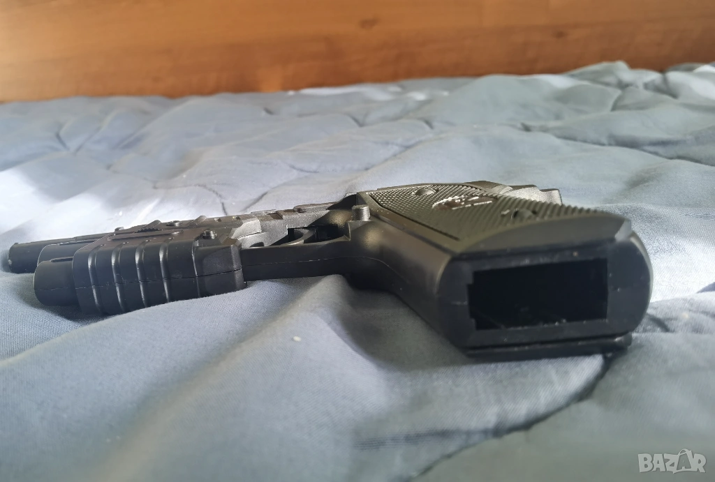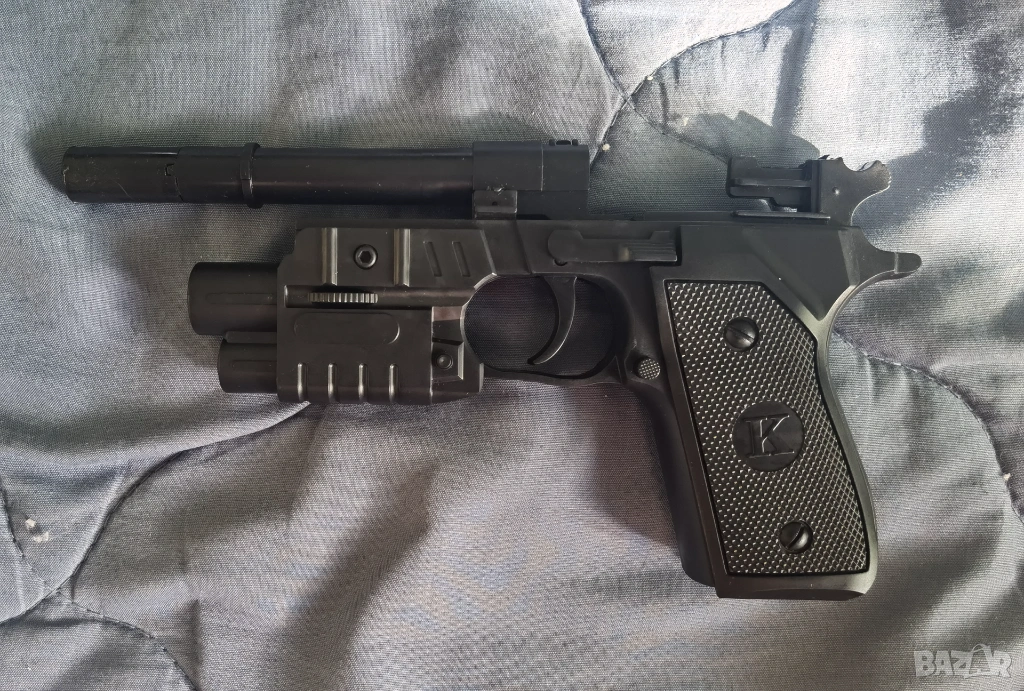 Детски пистолет играчка с лазерен мерник. Тъй като липсват две части (отгоре и където е пълнителят), се продава на символична цена. Лазерите се включват с червеното плъзгащо копче, което е от едната страна, близо до дулото. От горе се намира синята светлина, а отдолу е червената, която може да се използва и като лазерна показалка. Светлините работят