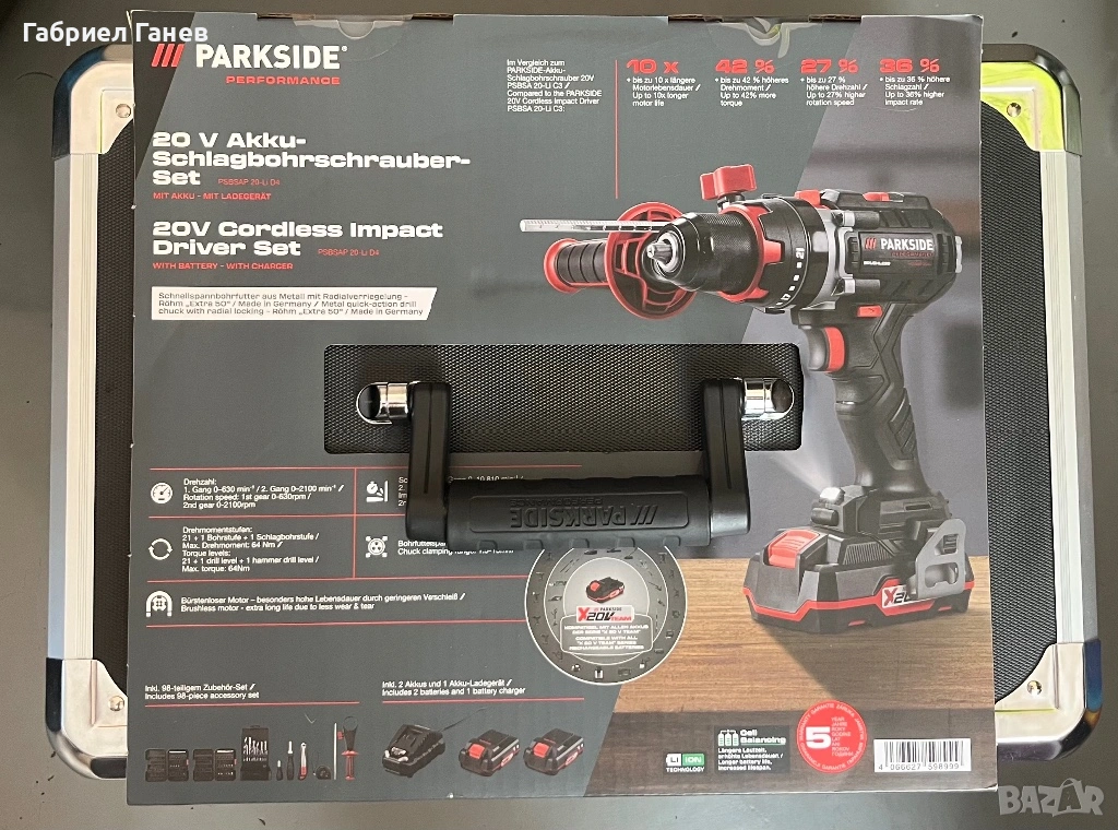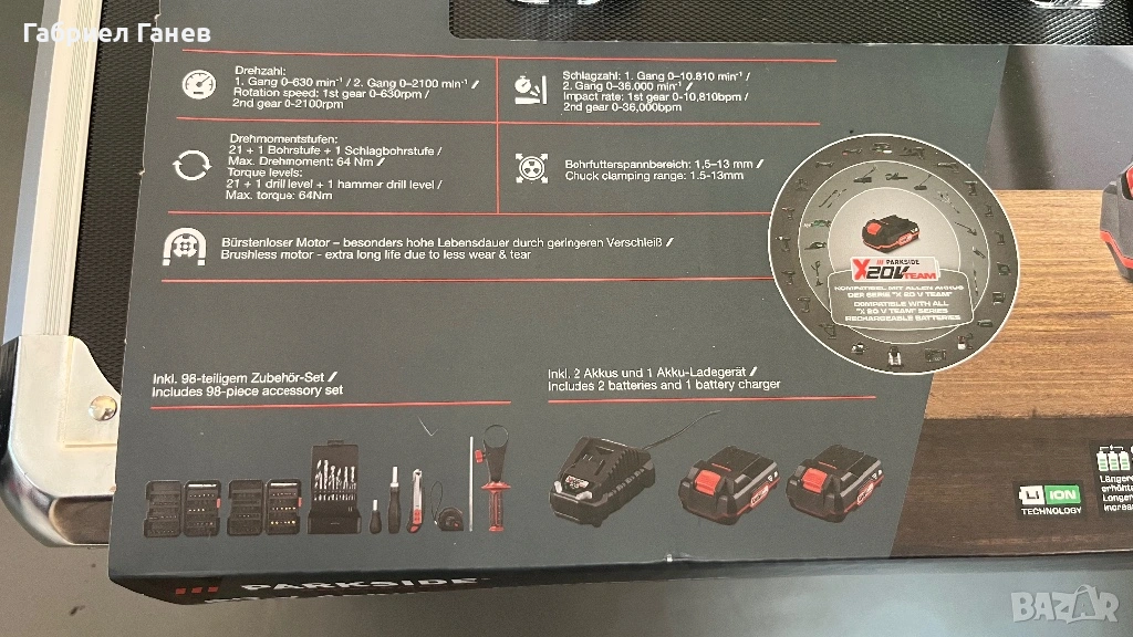 Пълен комплект ударна бормашина, включващ 2 акумулаторни батерии (2 Ah), 1 зарядно устройство за акумулаторни батерии (2,4 A) и набор от принадлежности от 98 части. Машината разполага с много мощен двигател с 2-скоростен редуктор и включващ се ударен механизъм. Оборудвана е с безчетков двигател (Brushless Motor), който осигурява по-дълъг експлоатационен живот благодарение на по-слабото износване.