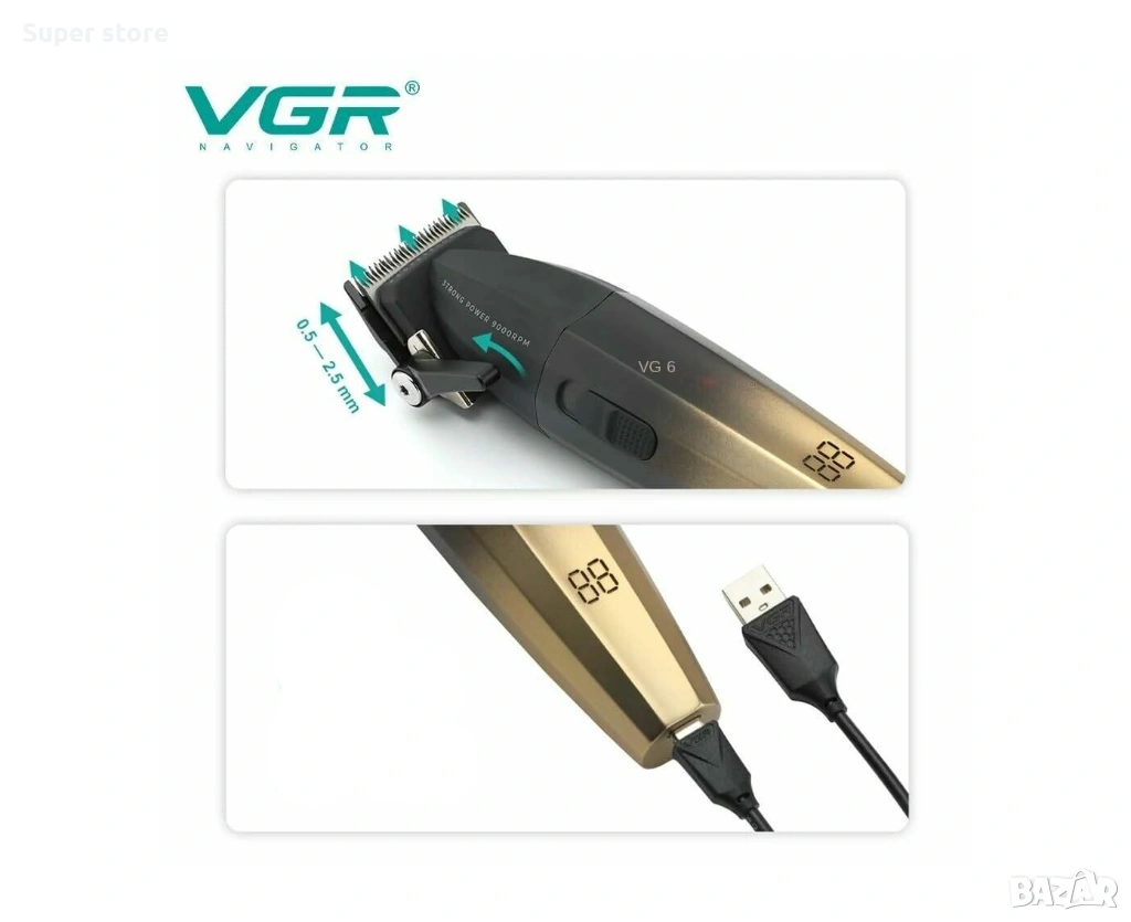 Оборудвана е с висококачествени остриета, които гарантират гладко и точно рязане без дърпане на косата. Вграденият LED дисплей показва нивото на батерията, което позволява по-добър контрол по време на работа. Машинката разполага с мощен мотор и турбо функция за по-ефективно подстригване.