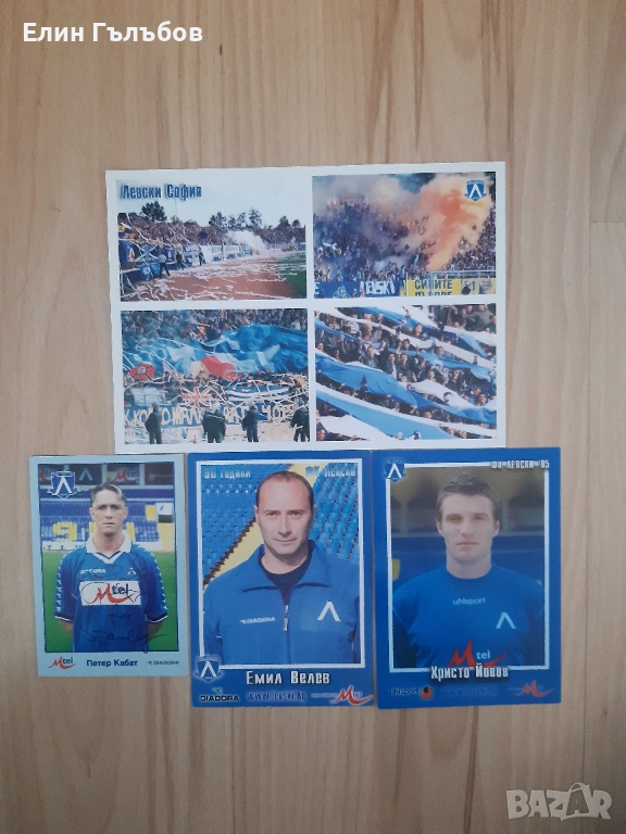 картички на Левски от минали сезони ,Ултрас картичка на агитката (УЛТРАС феновете) на Левски и картички с автографи на бившите футболисти на отбора на Левски - Петер Кабат и Емил Велев . Картичката на Христо Йовов е без автограф .