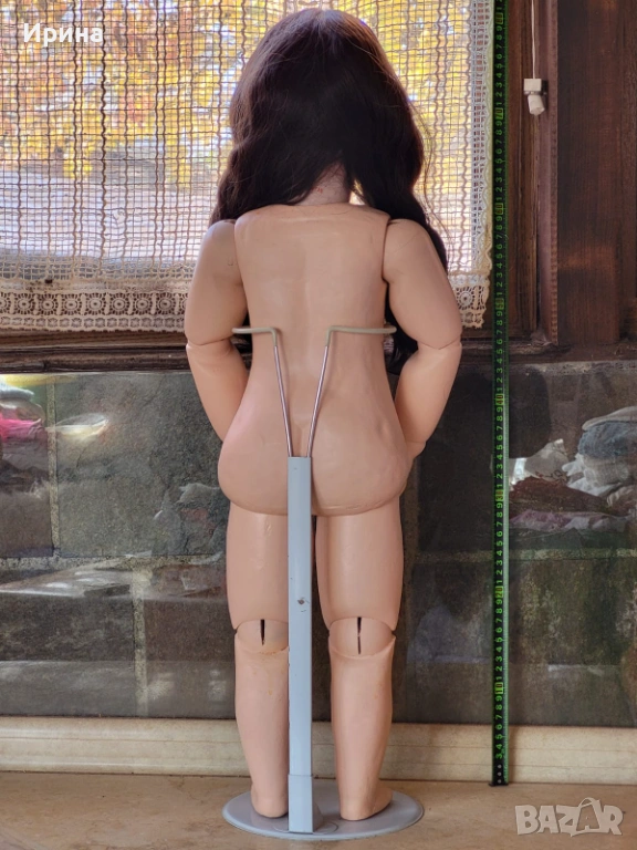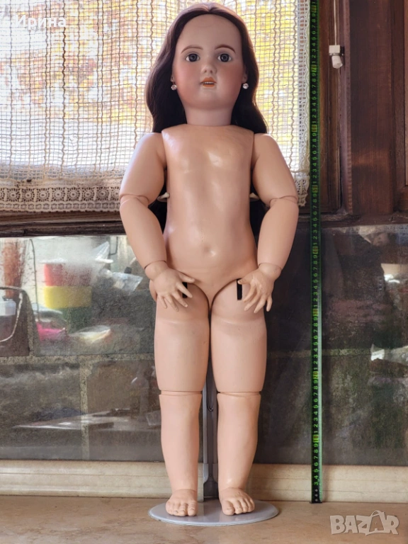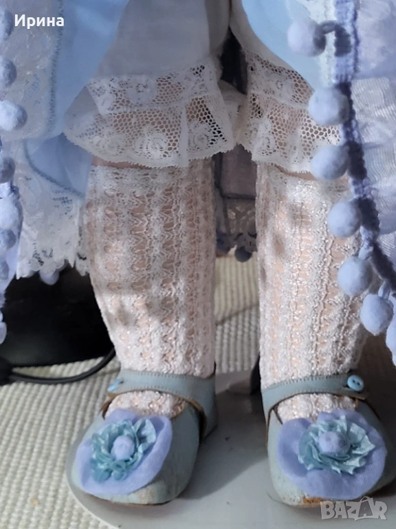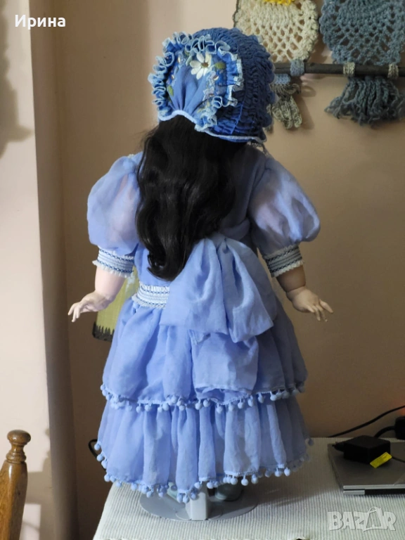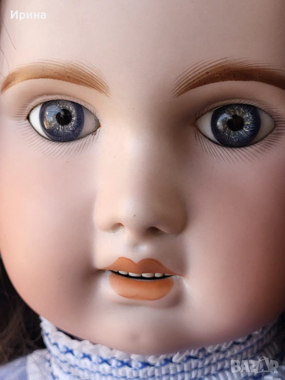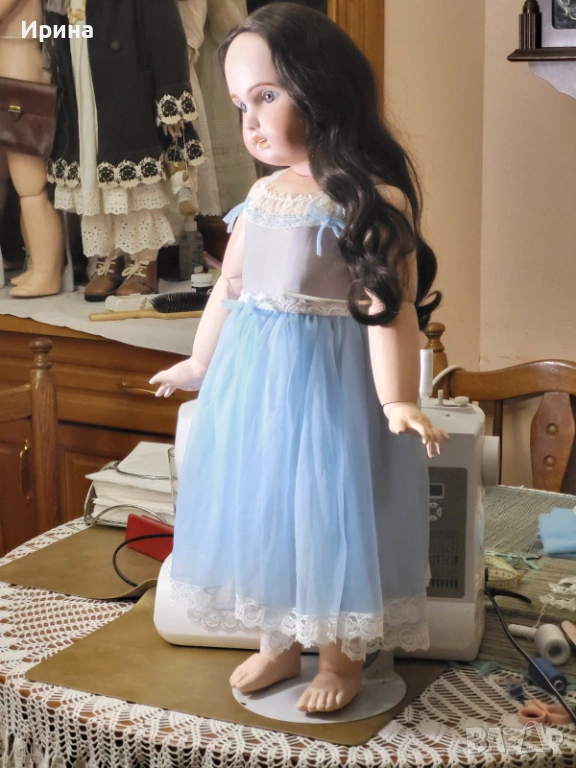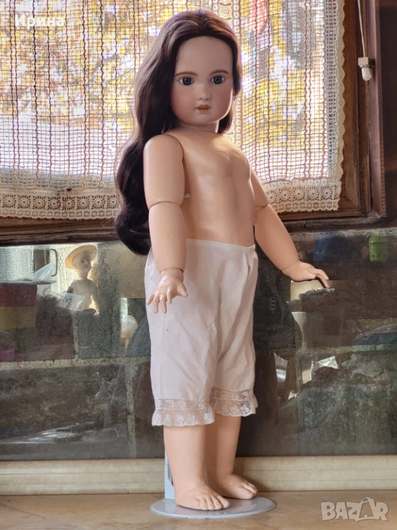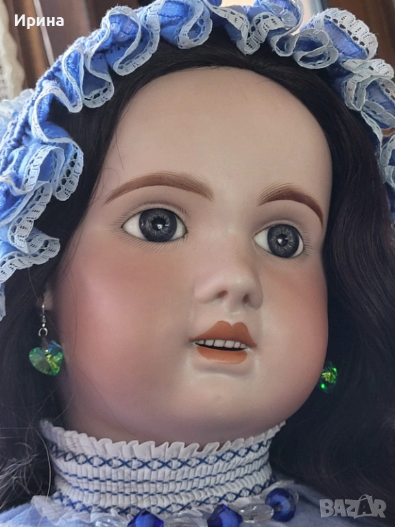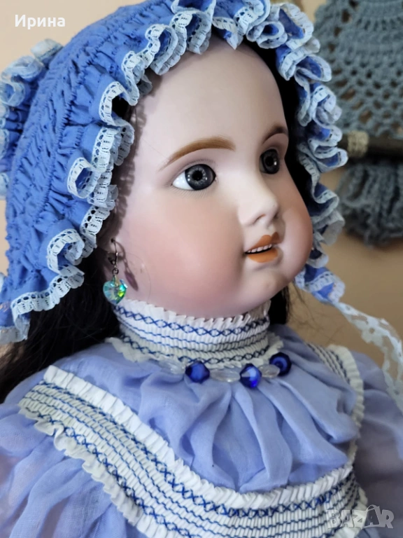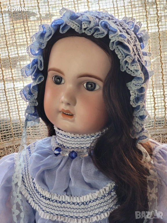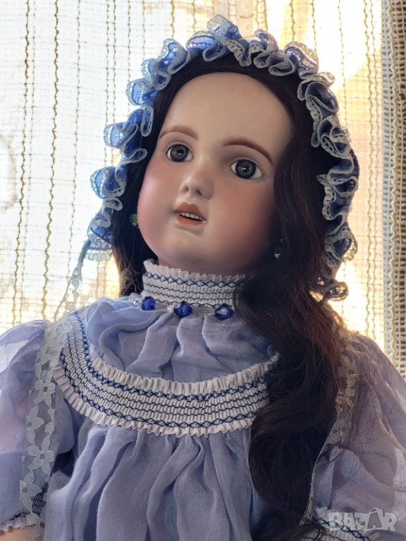 Огромна антична кукла, калъп номер 1907, от Jumeau. Височина: почти 80 см. Това е прекрасен пример за творчеството на този художник. Главата от бисквитена порцелана е осветена и не е показала никакви недостатъци, а червеният печат на производителя все още е налице. Оригиналното композитно тяло на Jumeau е с ново покритие и е в отлично състояние. Тя е пълничка, масивна и тежка. Това е рядка голяма кукла с размер 14. Година на производство: 1890 г., вероятно малко по-късно. Тя има очарователно изражение на лицето, нежната ѝ усмивка разкрива зъби, а красиви сини очи, създадени по стар метод на ръчно издухано стъкло, при който окото е плътно, а не кухо, са постоянно монтирани, както при ранните кукли. Синьото на очите ѝ е подчертано от обеци с форма на сърце от аквамарин. Техническият отвор на главата е допълнен от пей, изработен от корк. Перуката е изработена от естествена коса с дълги, меки къдрици. Това е добавено по-късно. Куклата има нова разтегливост, държи пози перфектно и може да стои без стойка. Тя носи красива синя рокля в различни нюанси, скроена според модата на нейното време и перфектно допълваща цвета на очите ѝ. Памучните ѝ бикини са наистина оригинални, украсени с дантела Valenciennes. Нежната ѝ долна рокля е изработена от винтидж тюл с двуслойна пола и пришита яка, включително презрамки с конци от тюл. Цялата яка и двата подгъва са декорирани с винтидж дантела. Горната рокля, изработена от прозрачен ефирен плат, е скроена с щедро драпиране. Ръкавите са без подплата, красиво разкривайки приятните извивки на раменете ѝ. Роклята е украсена с винтидж бяла драпирана плитка с големи шевове от тъмносиня бродерия. И двата слоя на полата са обшити с плитка с малки помпони в съответстващ цвят. Стоящата яка е акцентирана от нишка от сини и прозрачни мъниста, облицоващи огърлицата. Шапката ѝ е в по-тъмен нюанс. Тази красива шапка съответства на стила на роклята, показвайки още по-интензивно драпиране от плат, обшити с антична дантела и бродирани на гърба. Накрая лицето ѝ е обрамчено от пищна дантелена пяна, допълваща античния вид на куклата. Обувките са истински антични, изработени от естествена кожа в рядък син цвят и украсени с плат, антични сатенени панделки и малки помпони.
